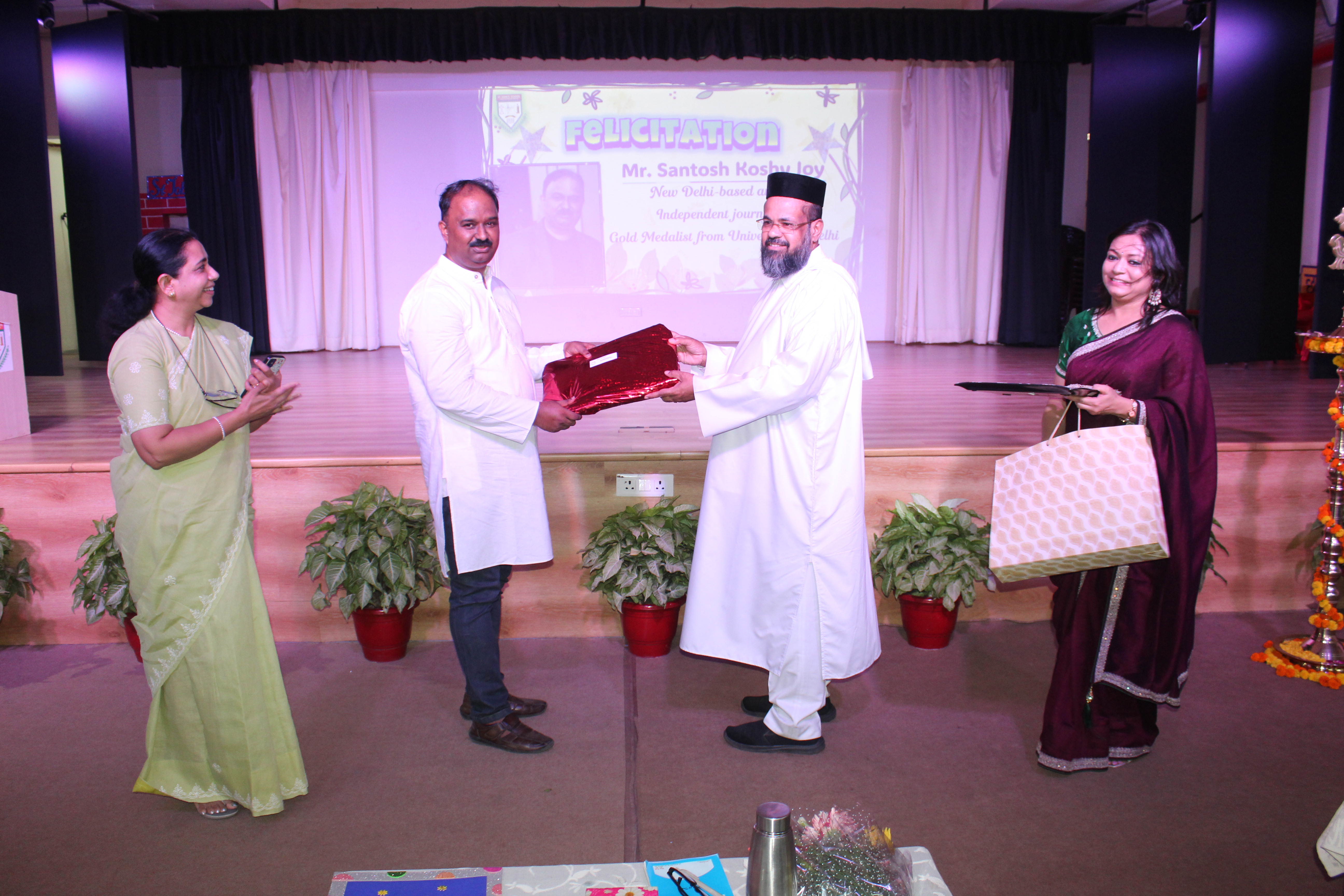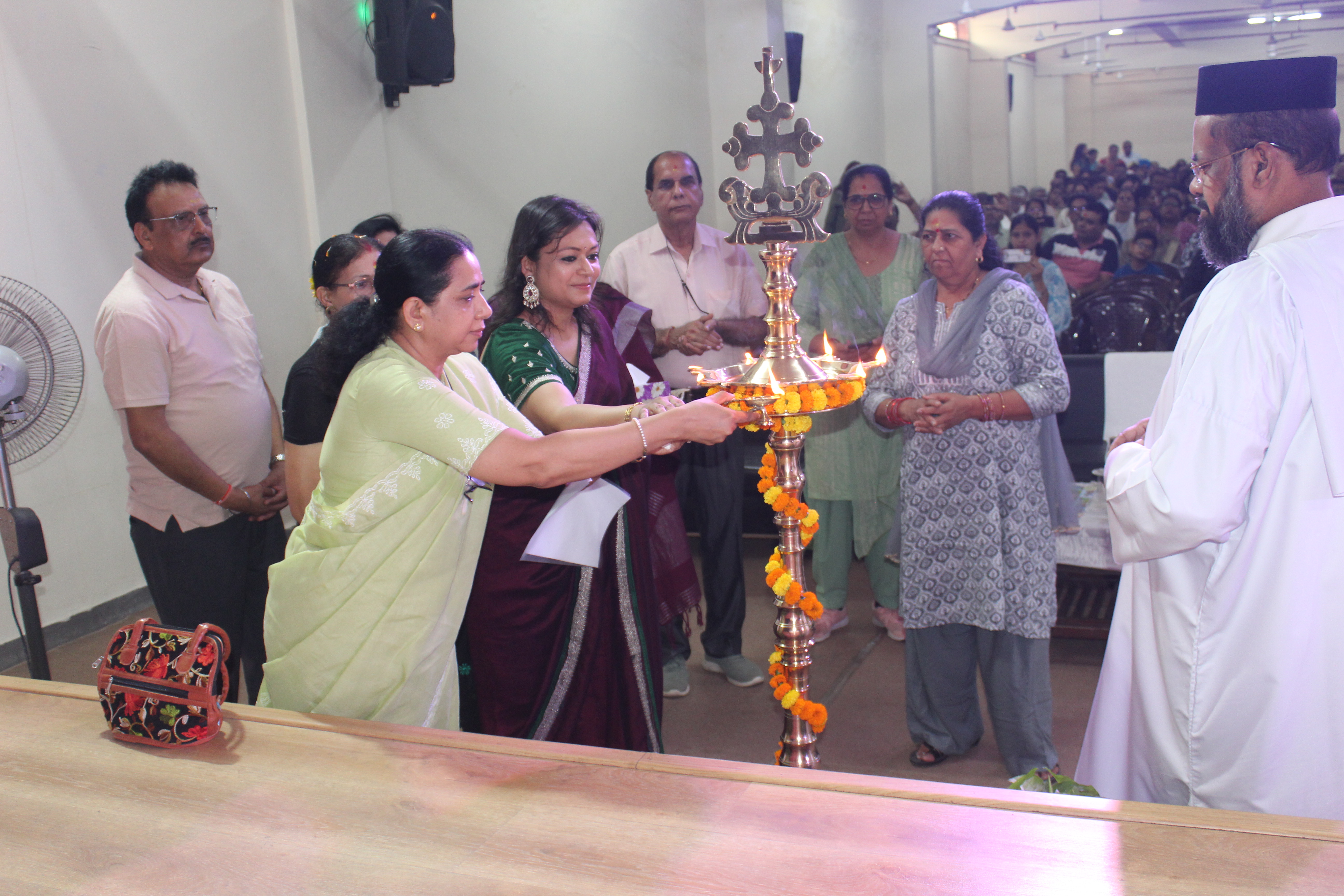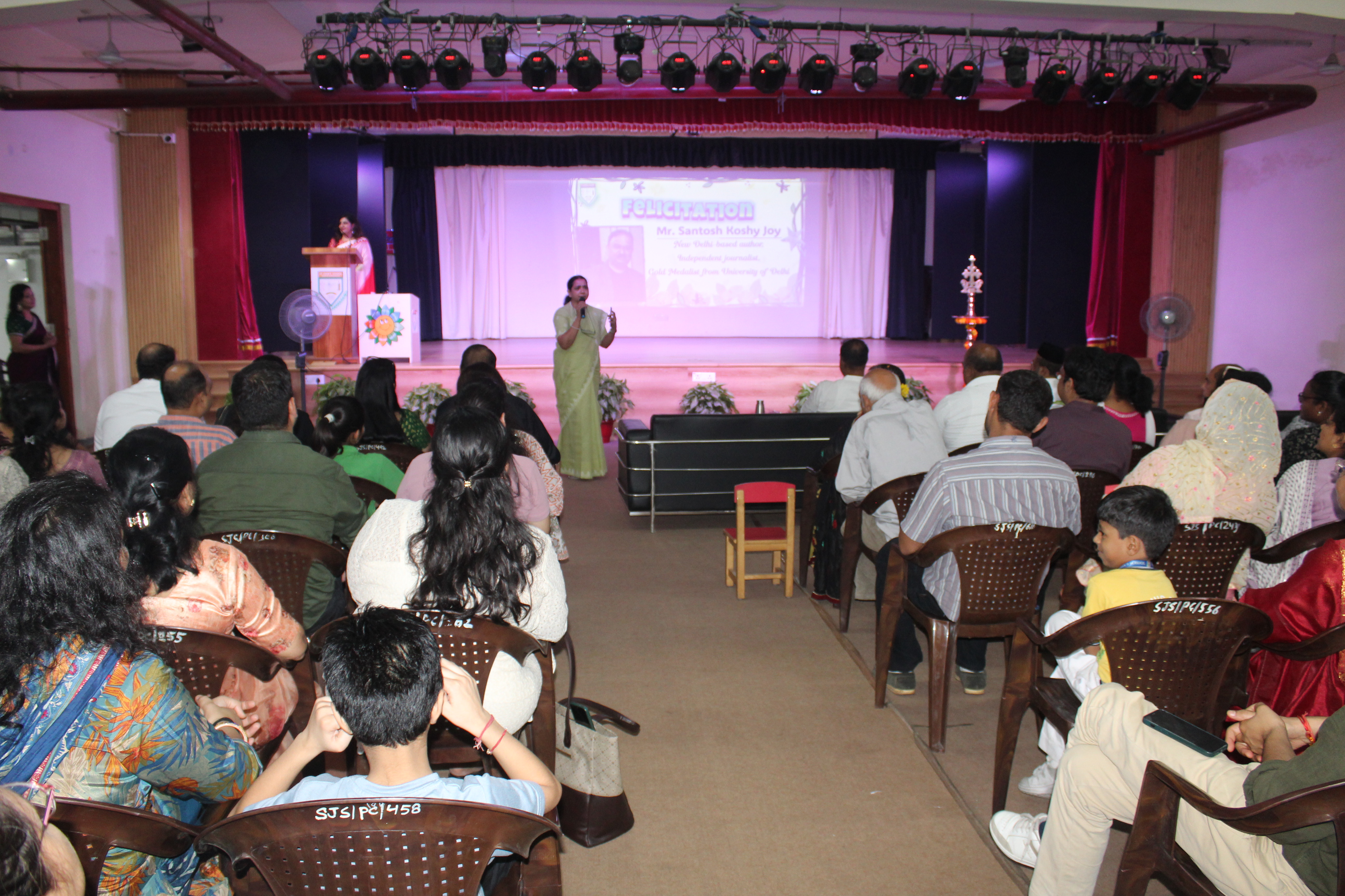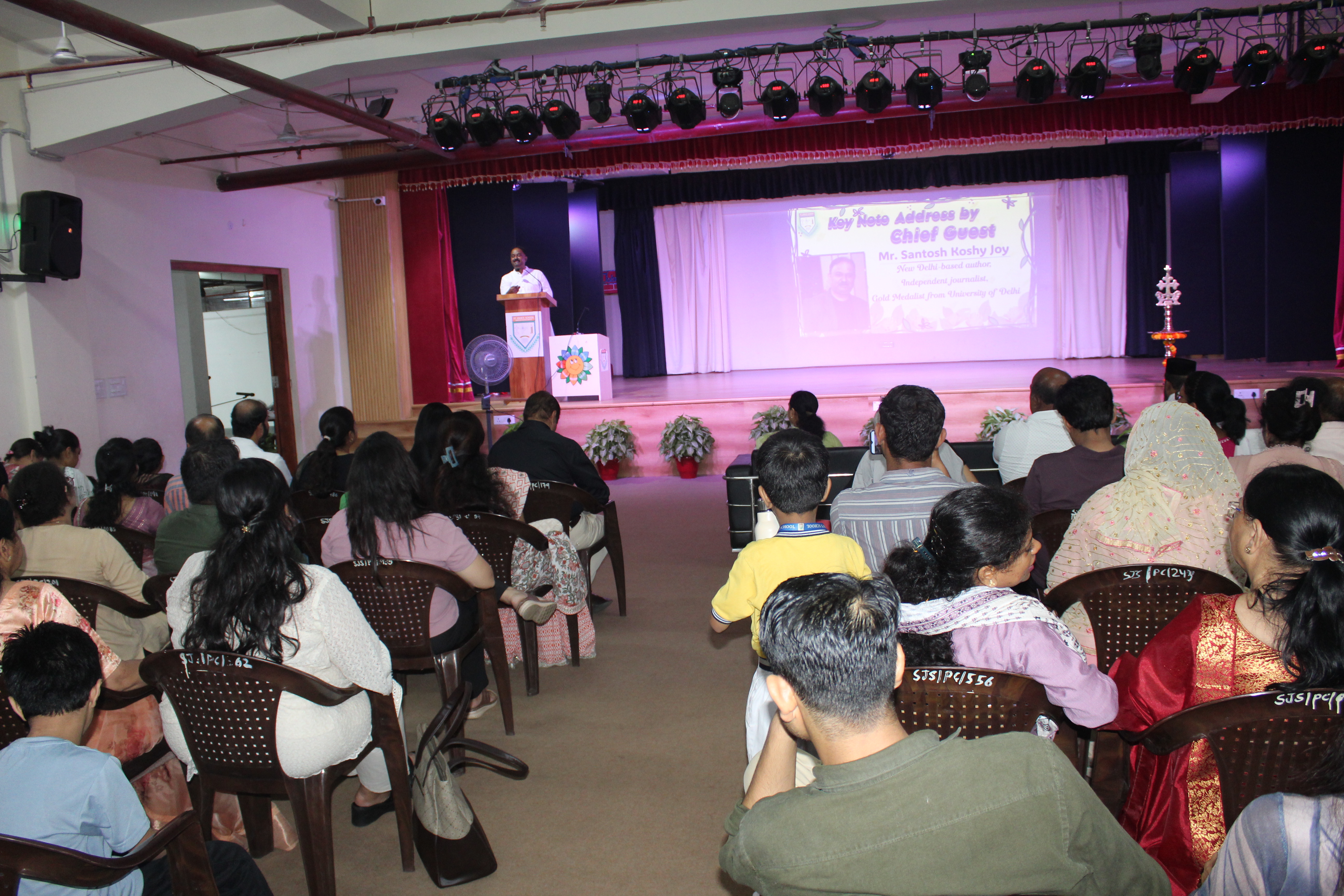 The program began with Divine Blessings and the Lord’s Prayer, followed by the lighting of the ceremonial lamp by Rev. Father T.J. Johnson, the Chief Guest Mr. Santosh Koshy Joy – an accomplished author, independent journalist, former parliamentarian, and doctoral scholar of social sciences at Delhi University, Principal Ms. Reeja Ninan and NTT Coordinator Ms. Rashmita Sarkar. This auspicious start symbolized spreading light, knowledge, and positivity.