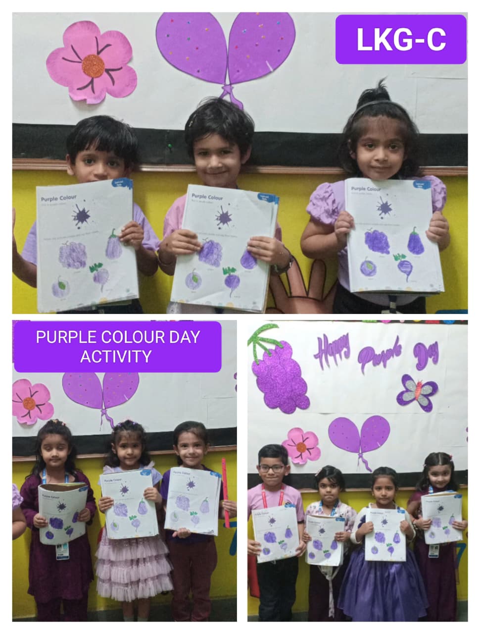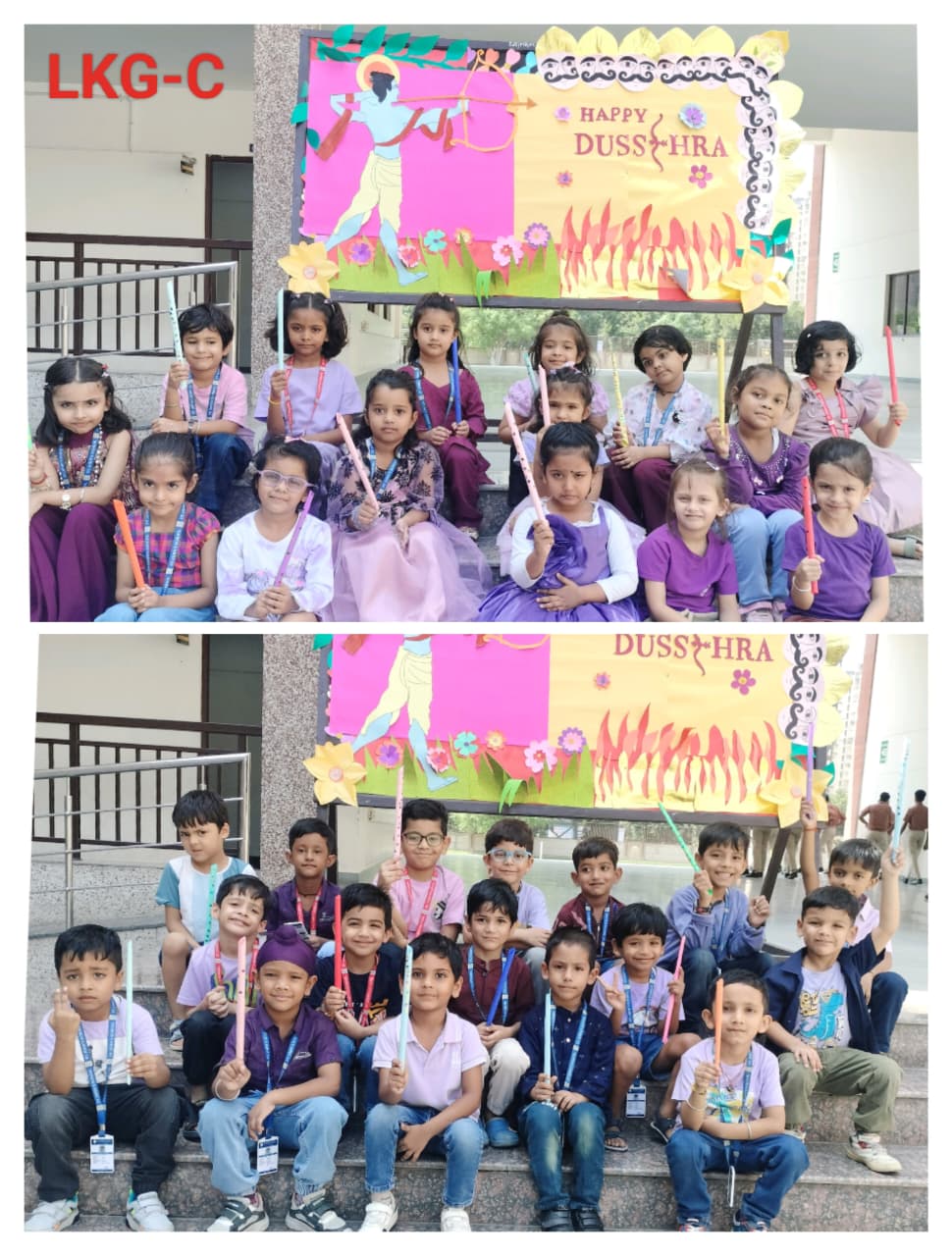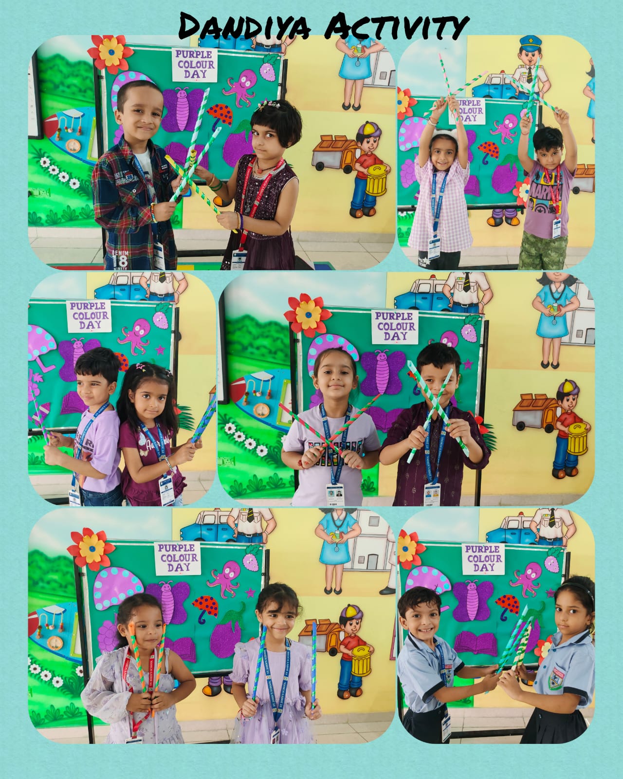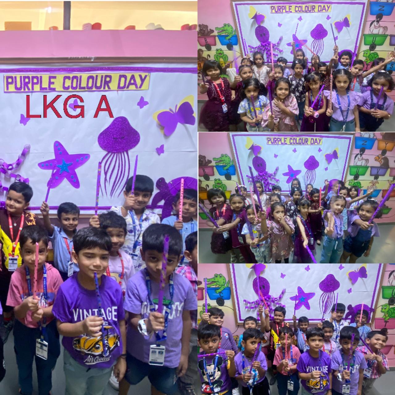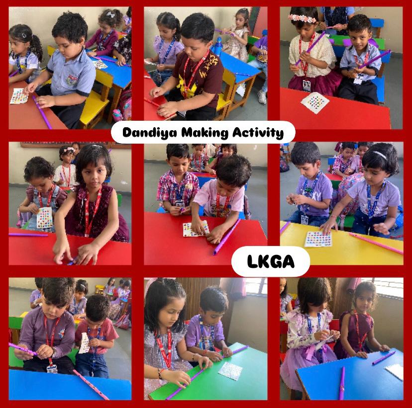 LKG students decorated colourful dandiya sticks and did colouring on purple objects.