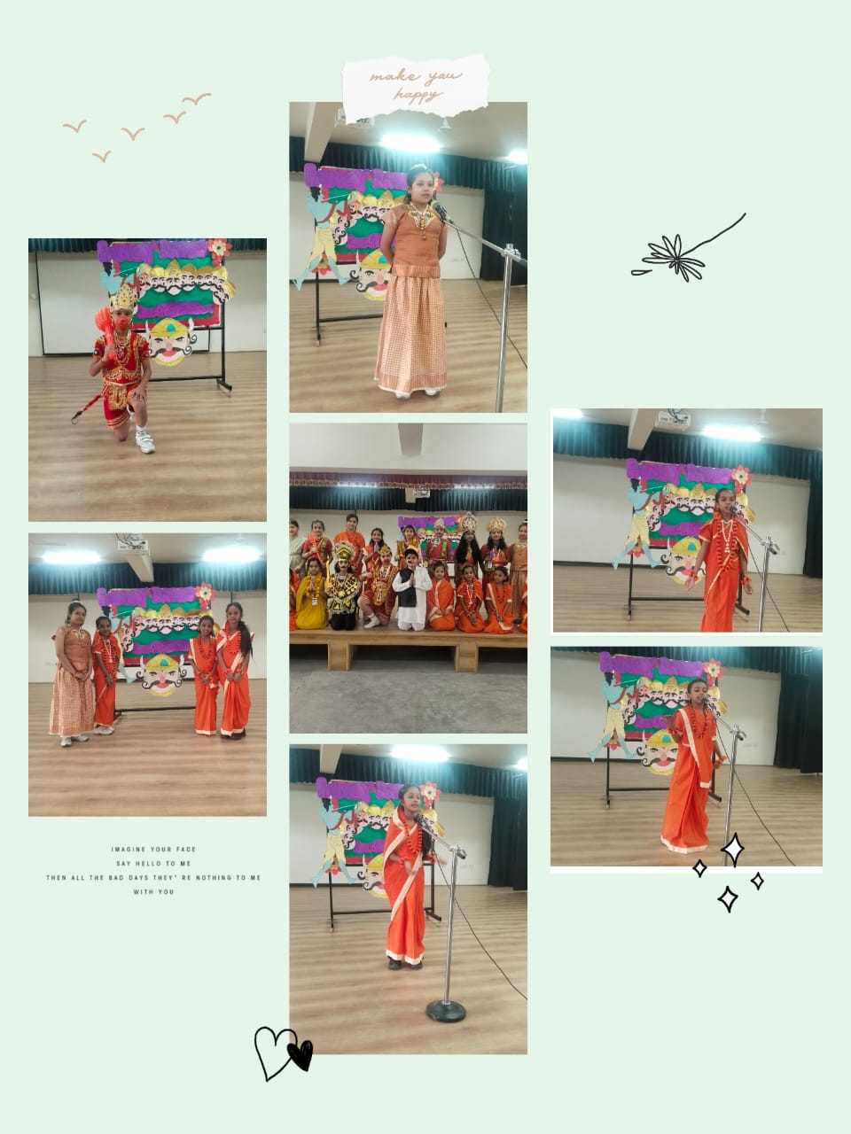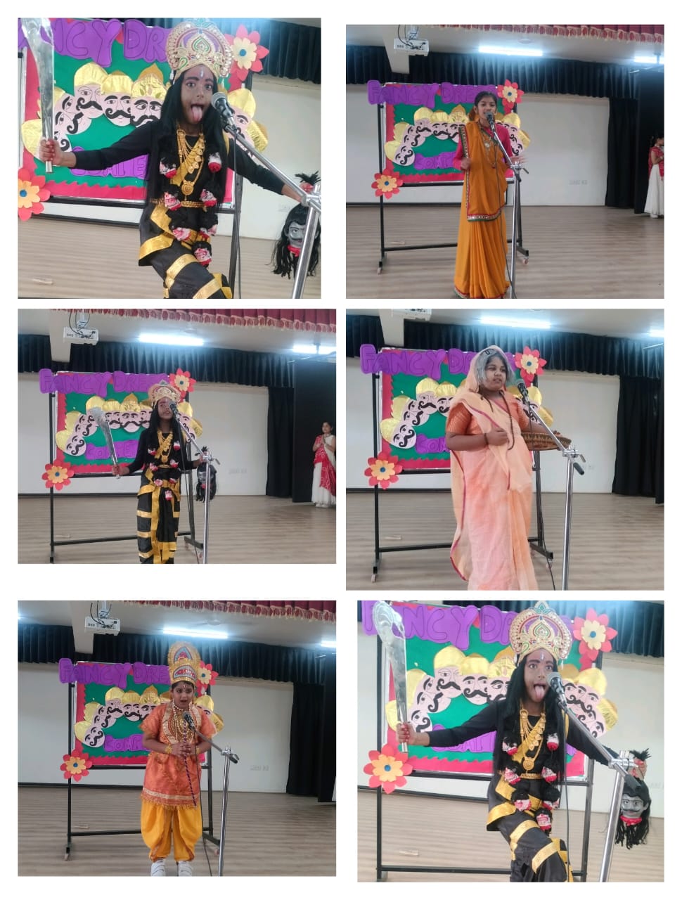 Dressed as mythological characters from the Ramayana—such as Lord Rama, Sita, Hanuman, and Ravana—the students brought the festive theme to life with great enthusiasm. Their graceful costumes, expressive dialogues, and confident performances beautifully conveyed the message of victory of good over evil.