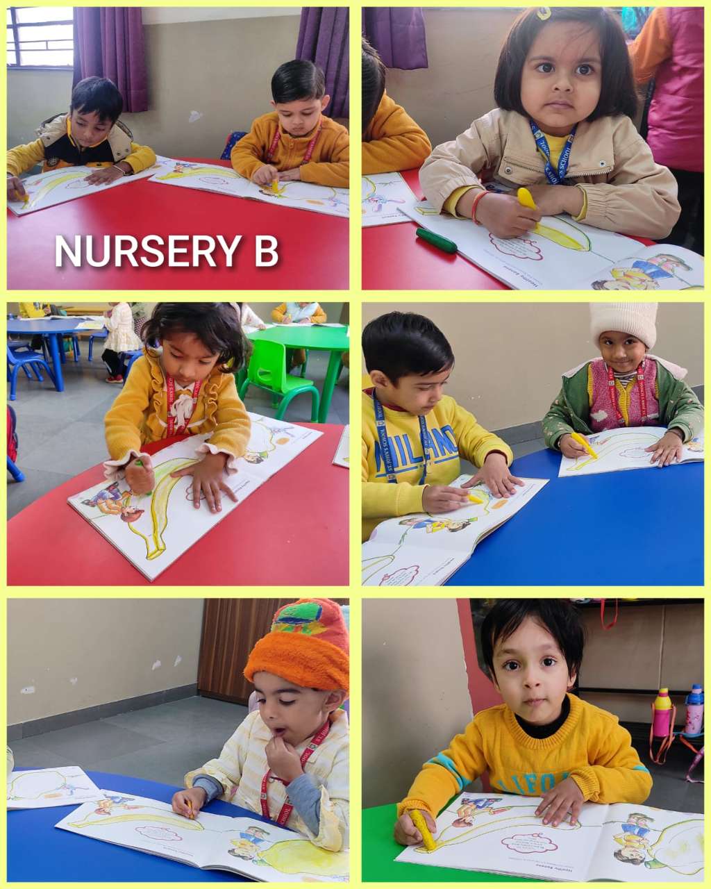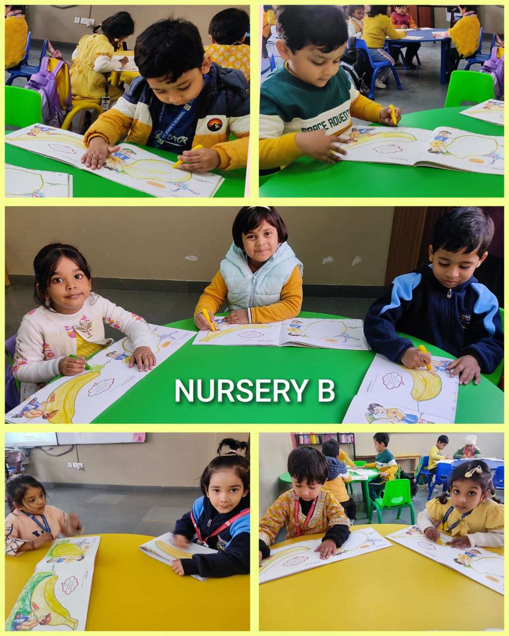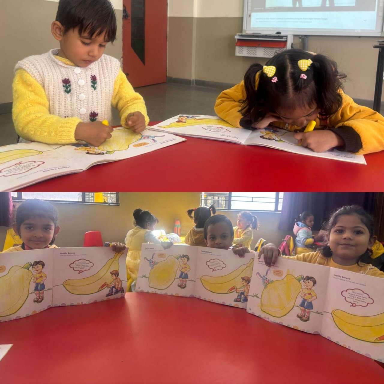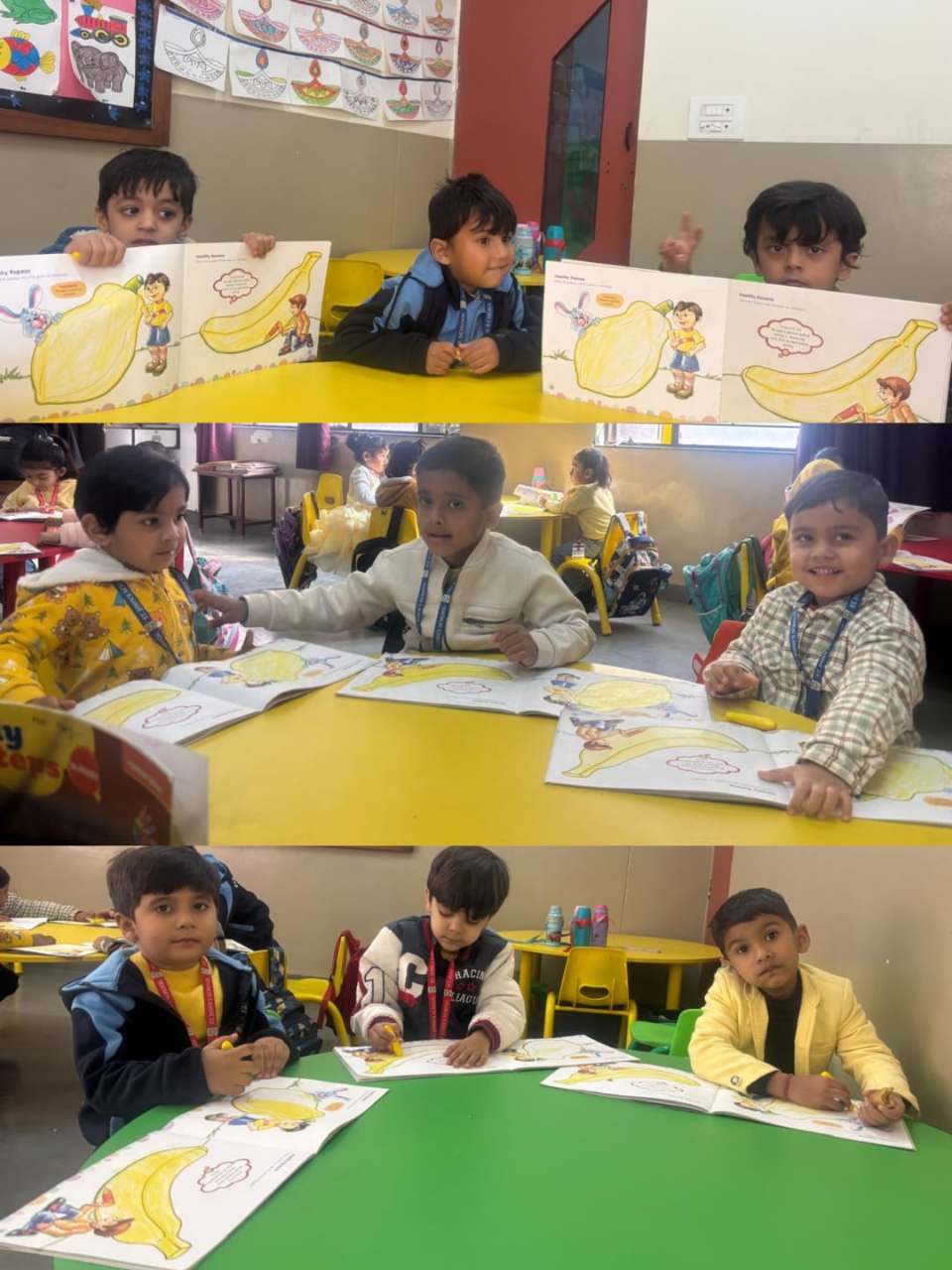Nursery students enjoyed colouring yellow-coloured objects, enhancing their colour recognition skills.