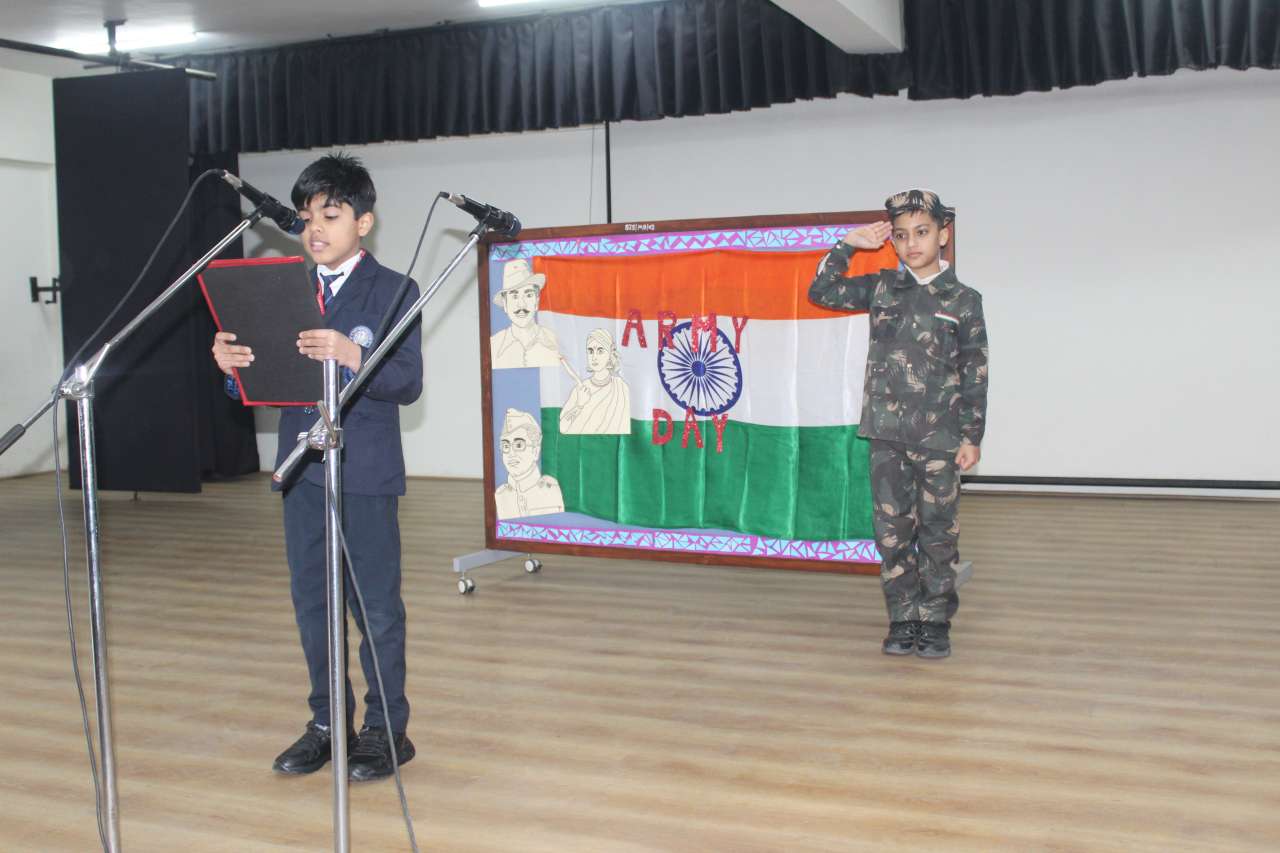 A special assembly on the occasion of Army Day was conducted by the students of Grade IV with great pride and enthusiasm. The assembly began with a prayer, followed by an introduction highlighting the significance of Army Day and the vital role of the Indian Army in safeguarding our nation. Students delivered a meaningful speech expressing gratitude and respect for the courage, discipline, and sacrifices of our brave soldiers.