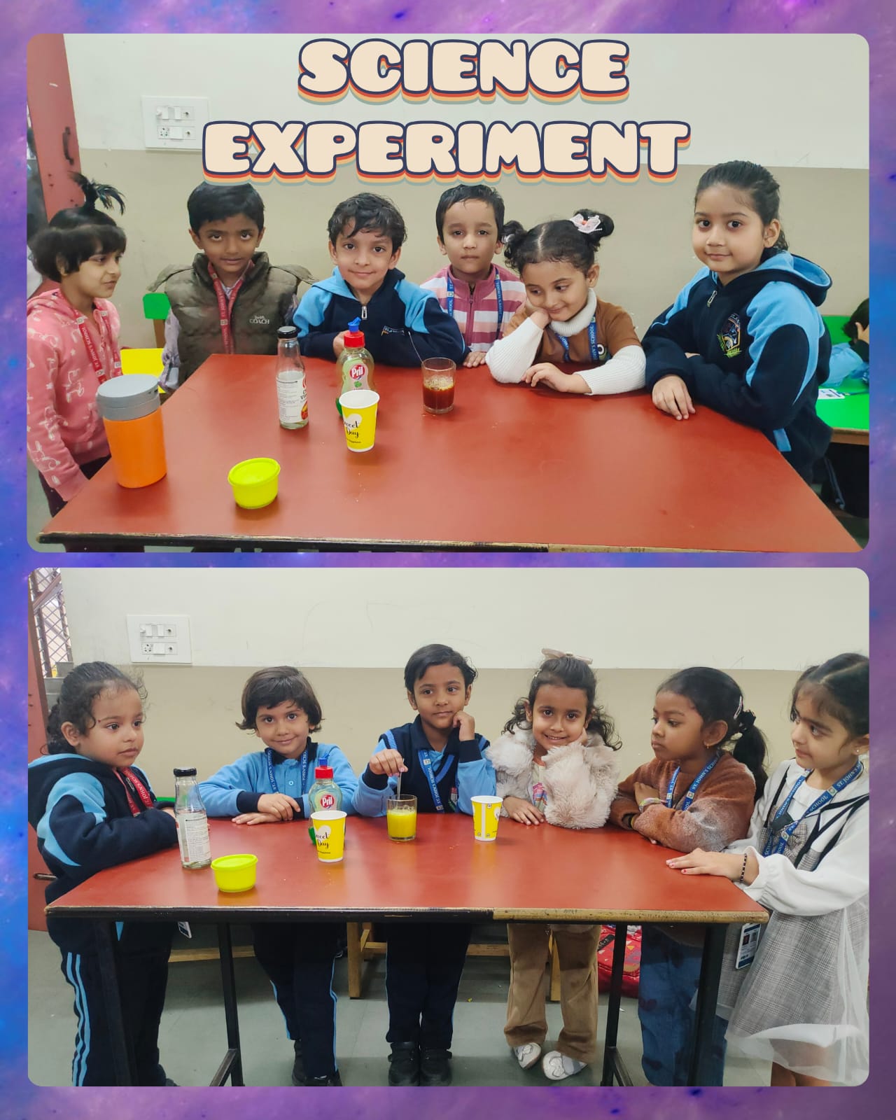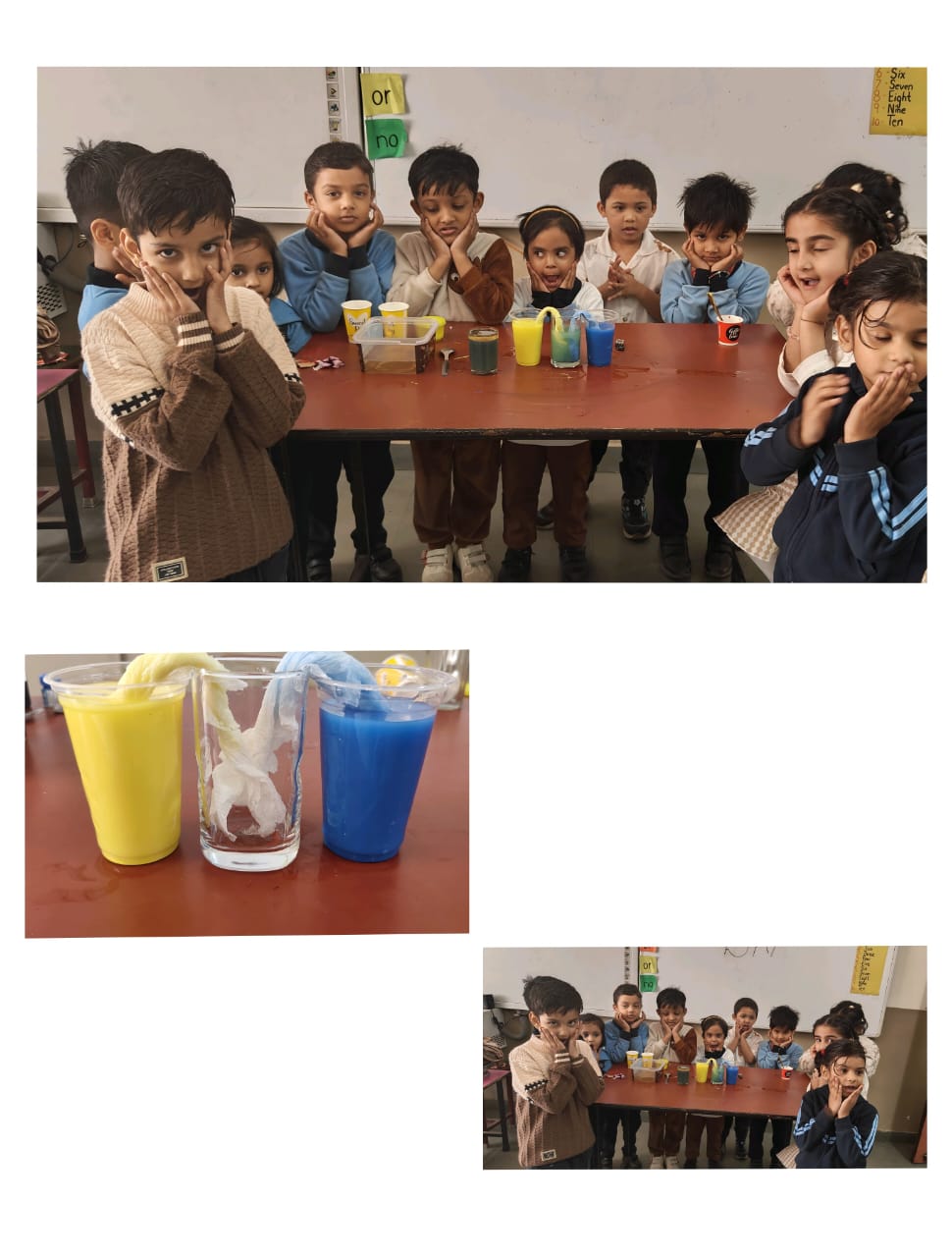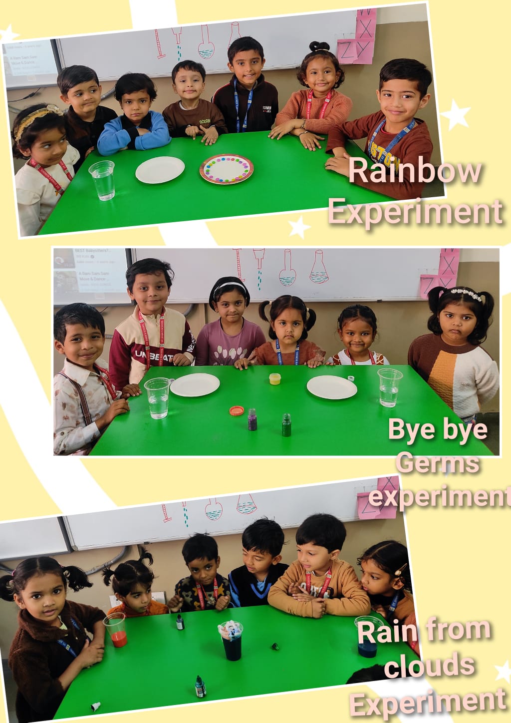 Alongside colour activities, all kindergarten sections actively participated in various science experiments. Children were excited to explore activities such as “Go Away Germs,” rainbow experiments, colour-changing water, Rain from clouds, and many more simple experiments. These hands-on activities helped children observe, question, and understand basic scientific concepts in a playful manner.