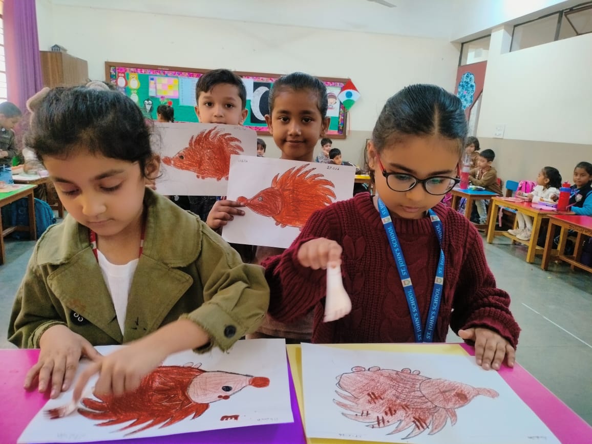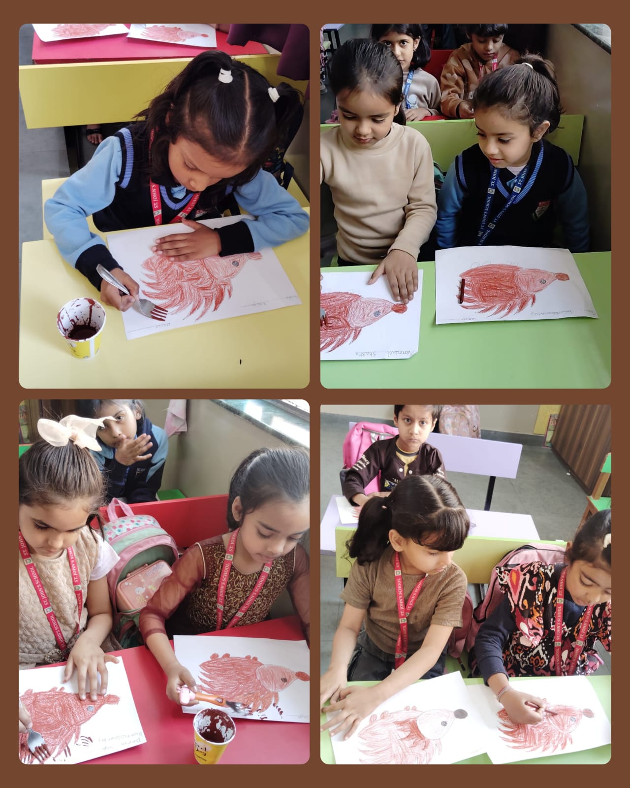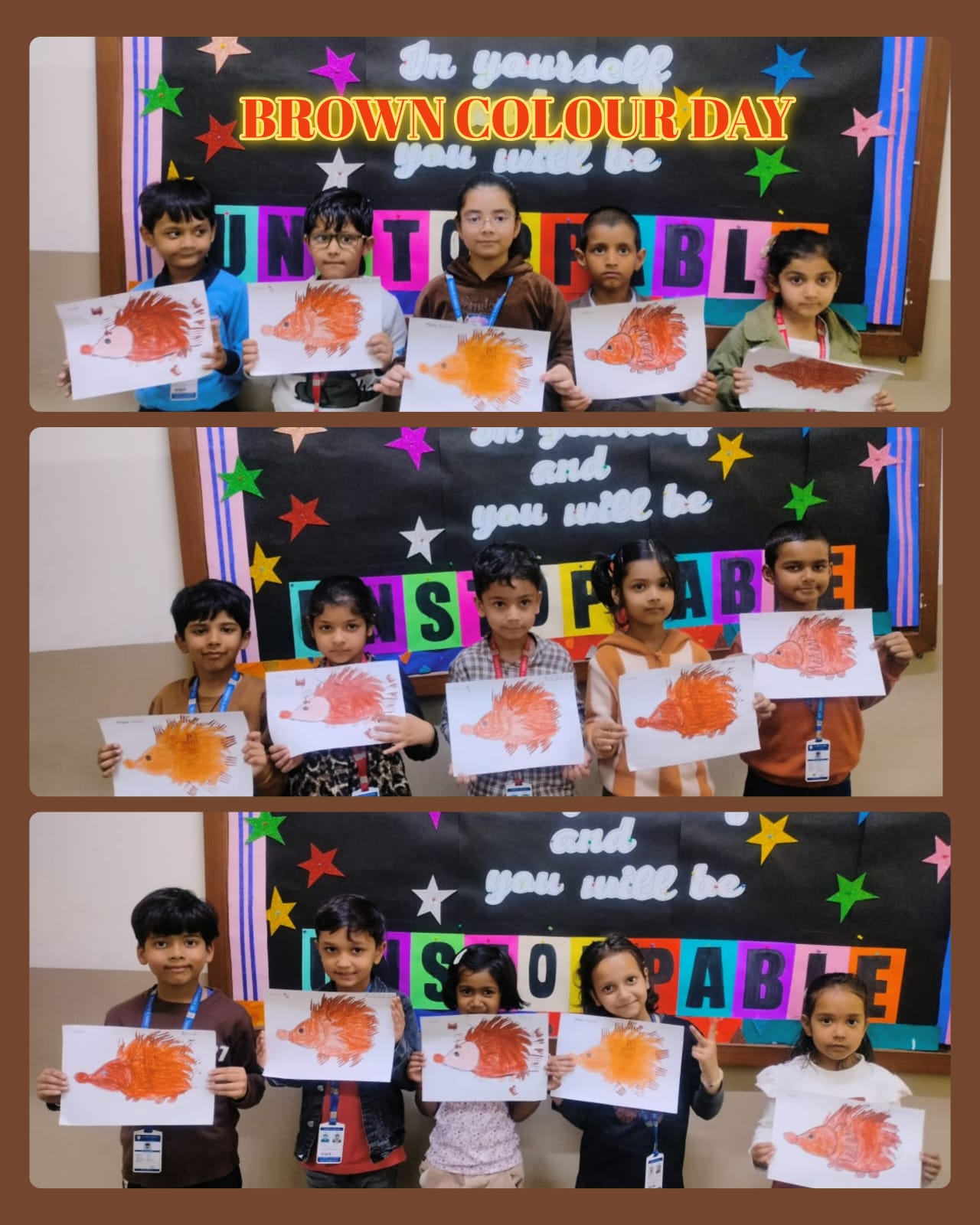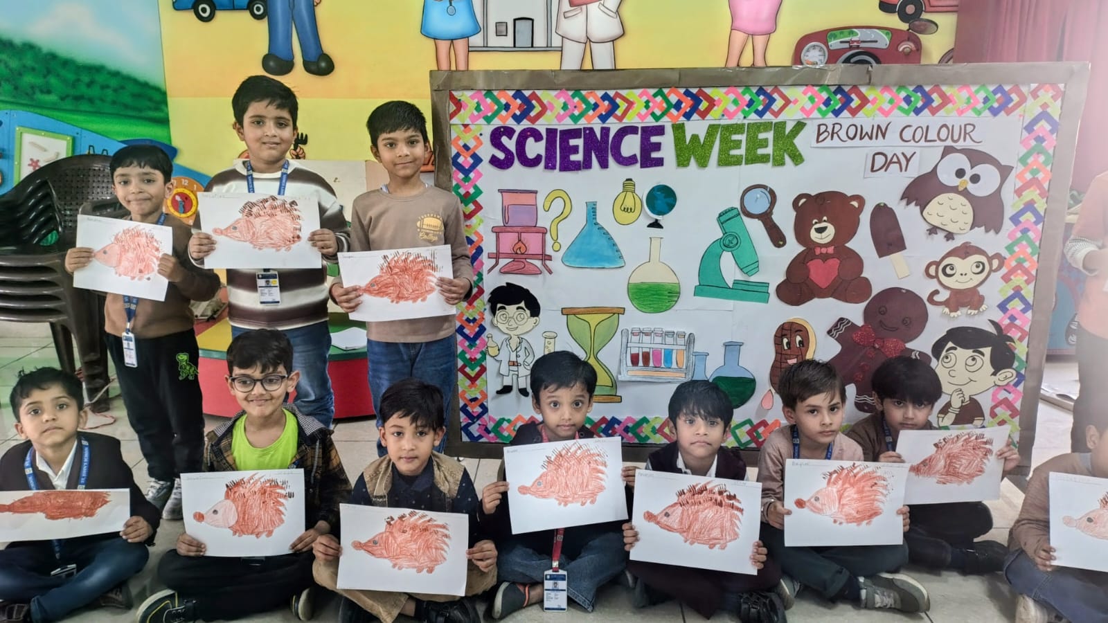 Children came dressed in brown-coloured attire, filling the classrooms with warmth and enthusiasm. Each class participated in age-appropriate and engaging activities. Nursery children enjoyed colouring an ice-cream worksheet, enhancing their fine motor skills. LKG students drew and coloured a cute teddy bear, expressing their creativity, while UKG children explored textures through fork printing on a porcupine, making the activity both fun and innovative.