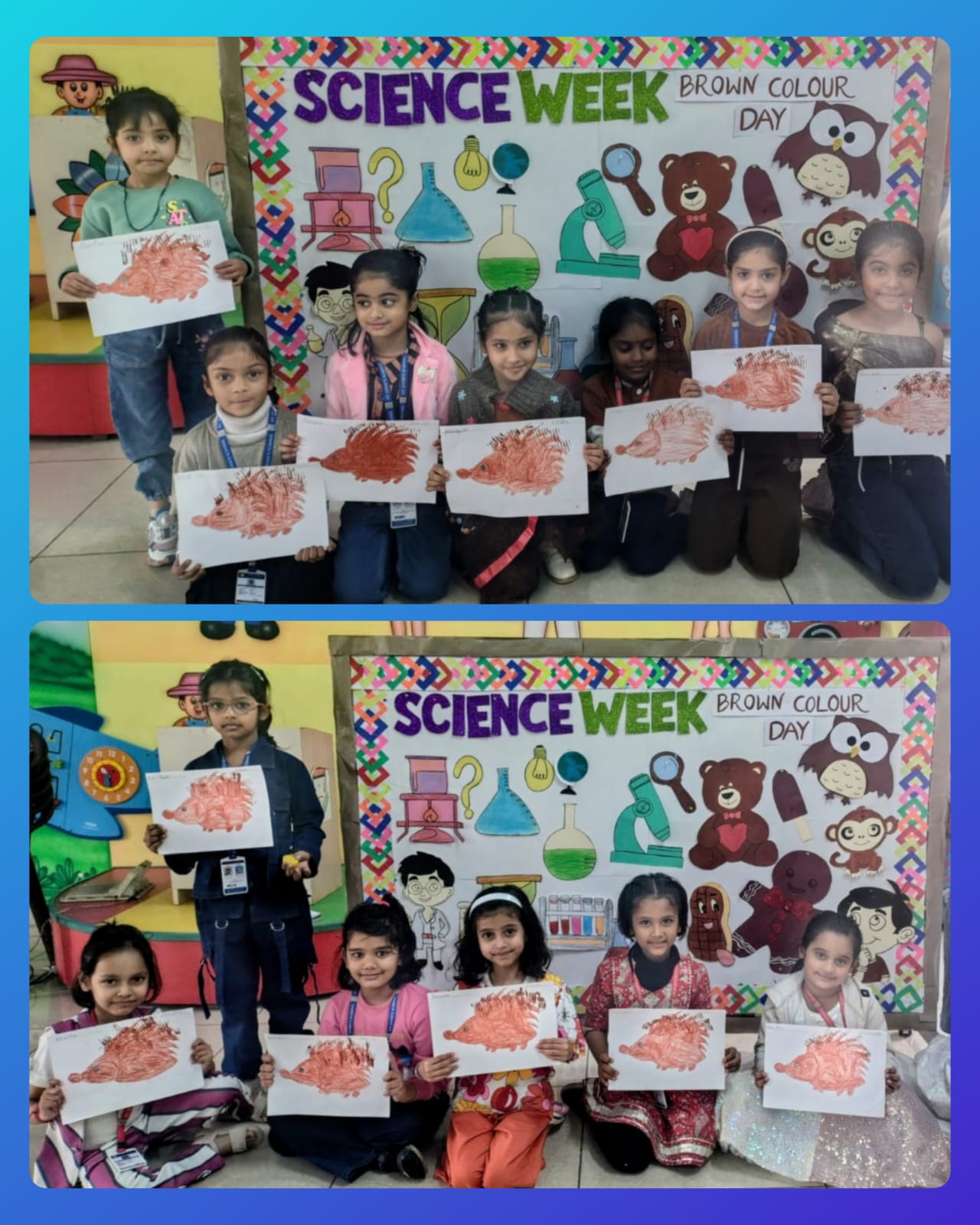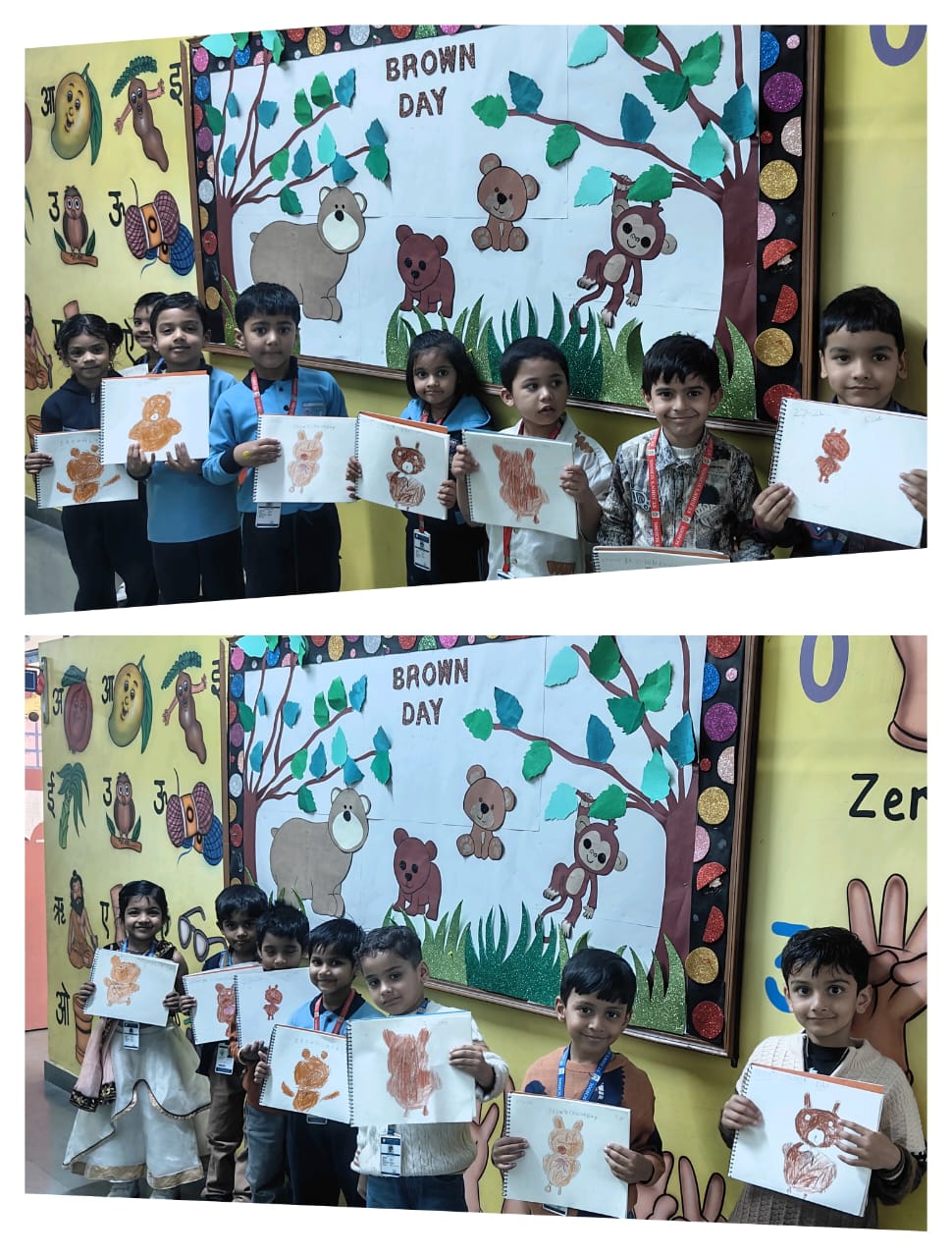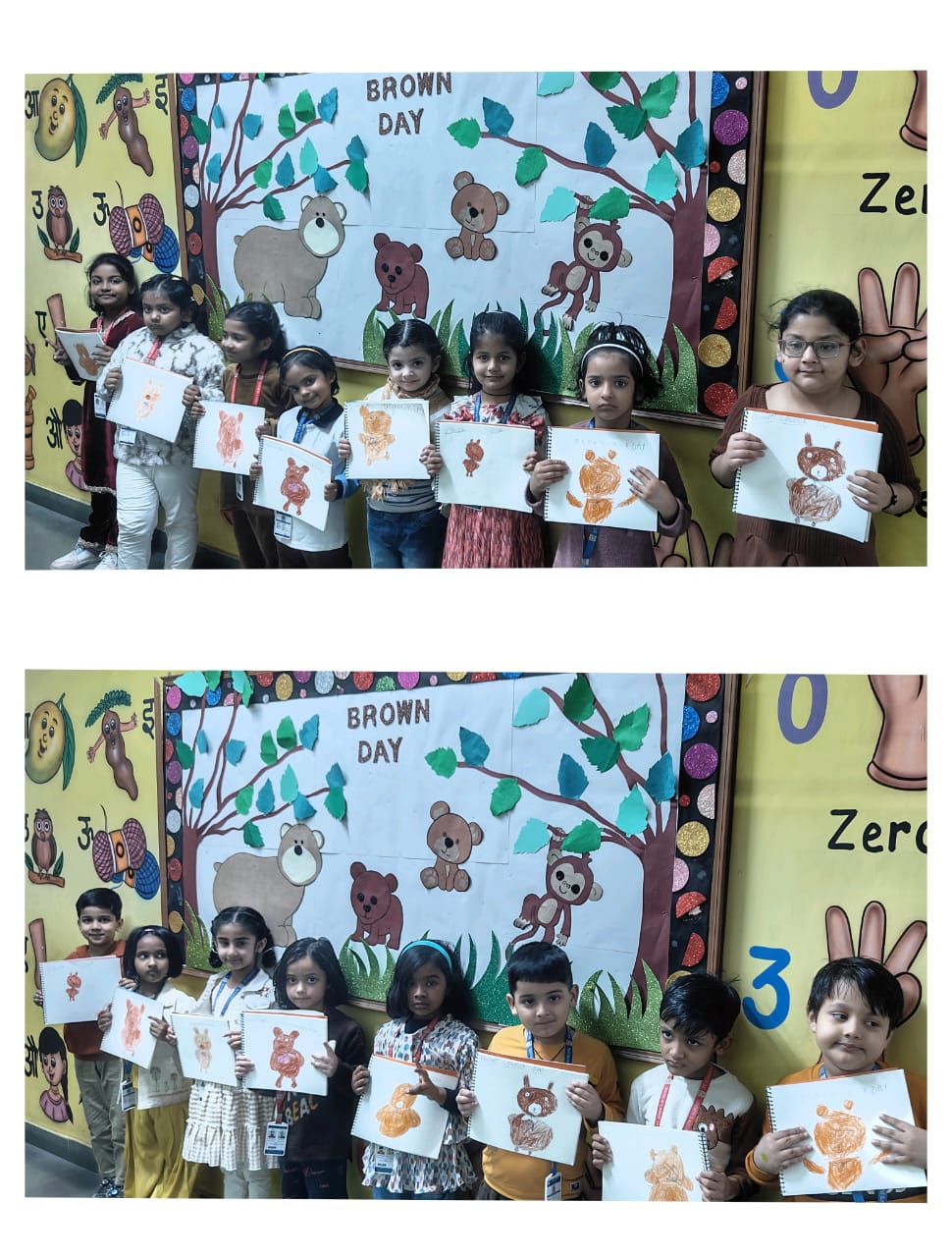Children came dressed in brown-coloured attire, filling the classrooms with warmth and enthusiasm. Each class participated in age-appropriate and engaging activities. Nursery children enjoyed colouring an ice-cream worksheet, enhancing their fine motor skills. LKG students drew and coloured a cute teddy bear, expressing their creativity, while UKG children explored textures through fork printing on a porcupine, making the activity both fun and innovative.