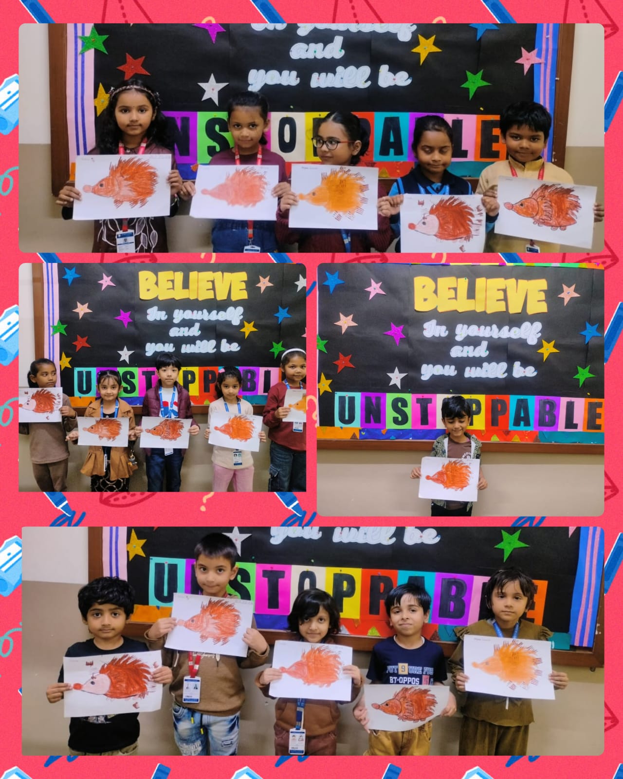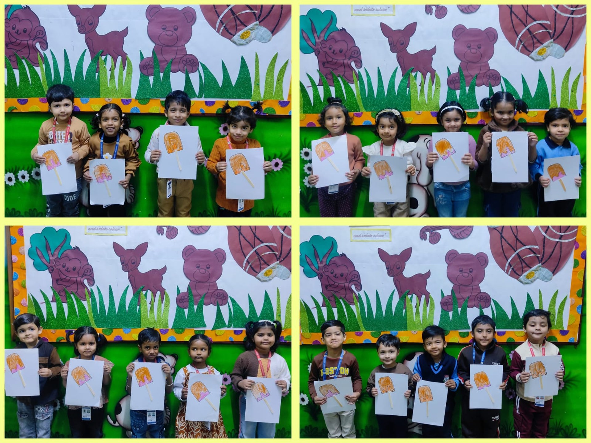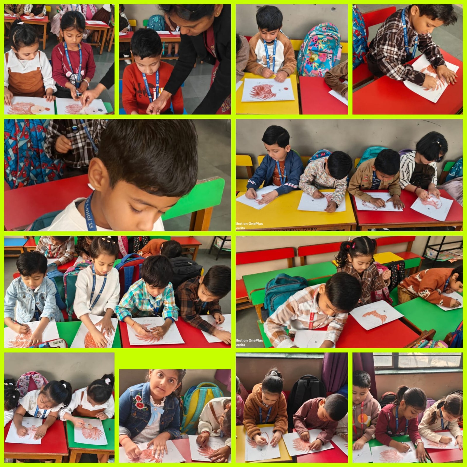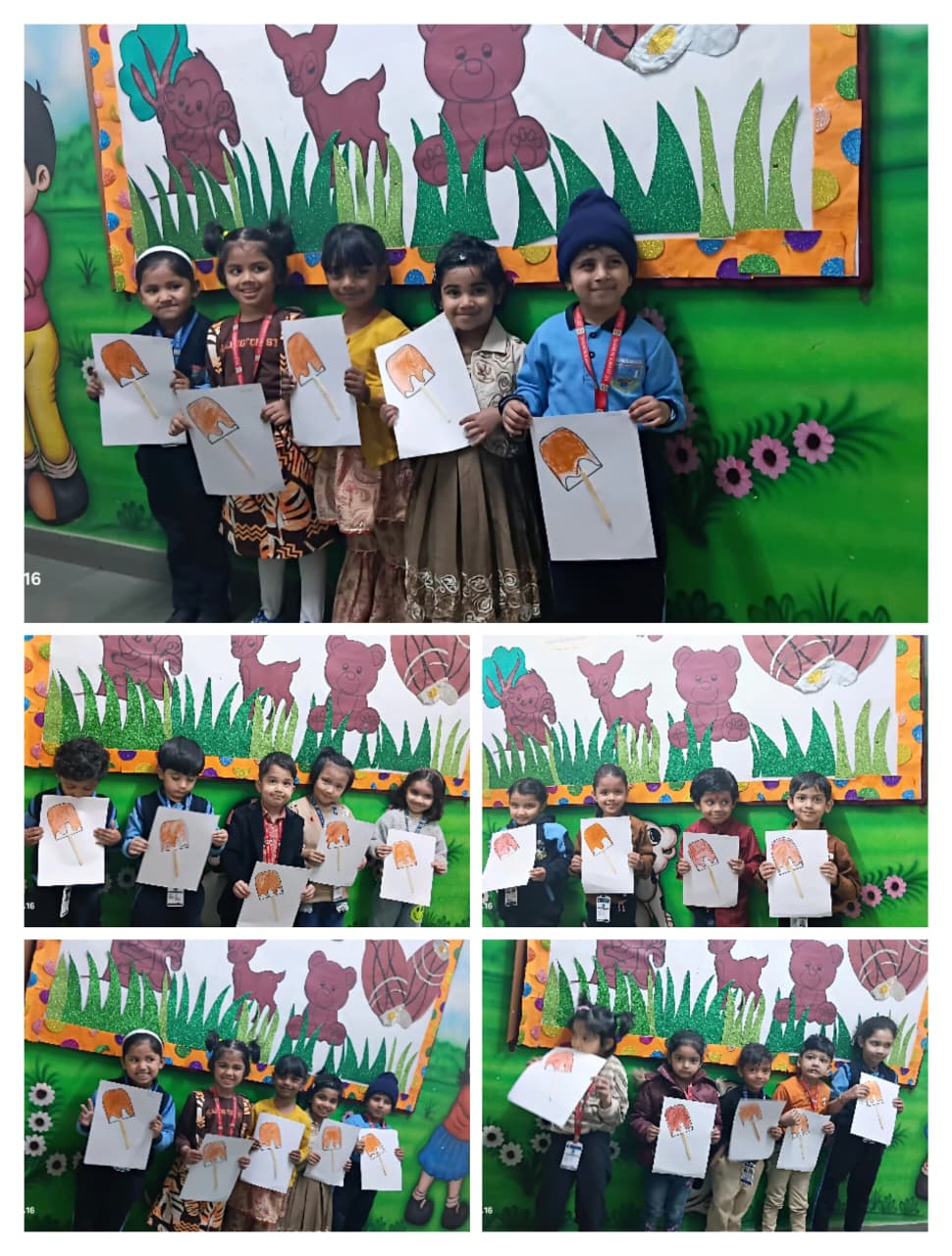 Children came dressed in brown-coloured attire, filling the classrooms with warmth and enthusiasm. Each class participated in age-appropriate and engaging activities. Nursery children enjoyed colouring an ice-cream worksheet, enhancing their fine motor skills. LKG students drew and coloured a cute teddy bear, expressing their creativity, while UKG children explored textures through fork printing on a porcupine, making the activity both fun and innovative.