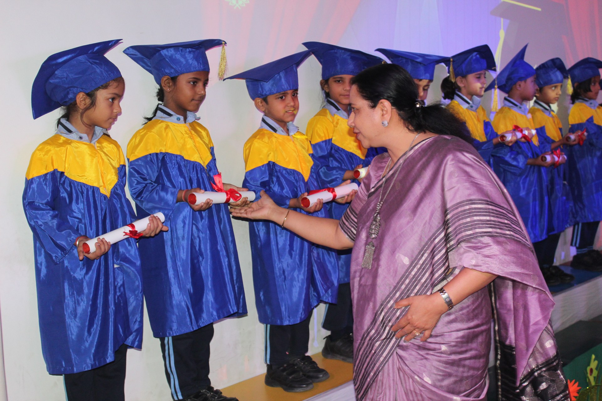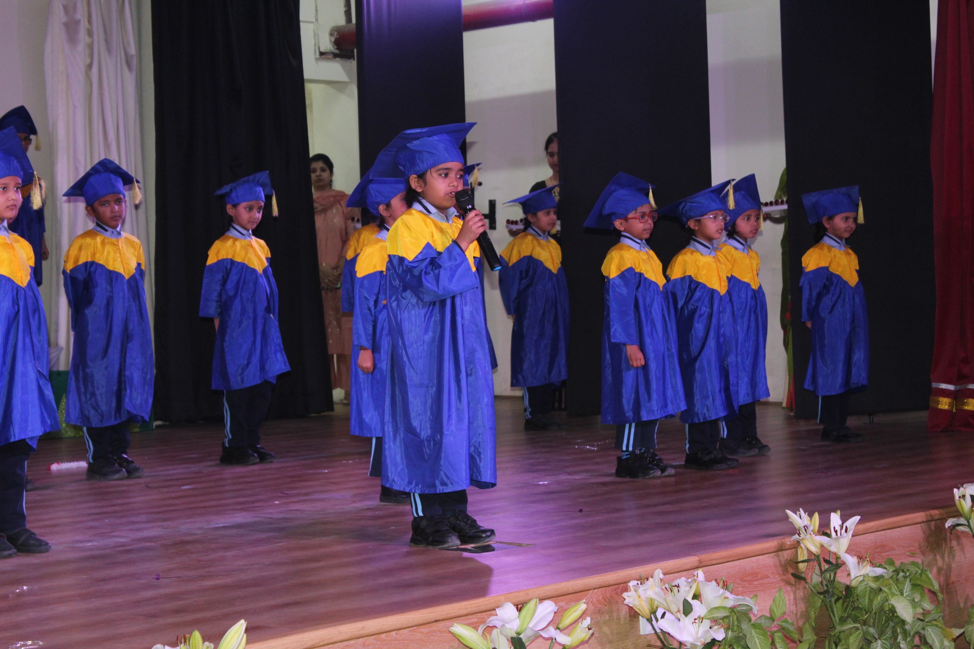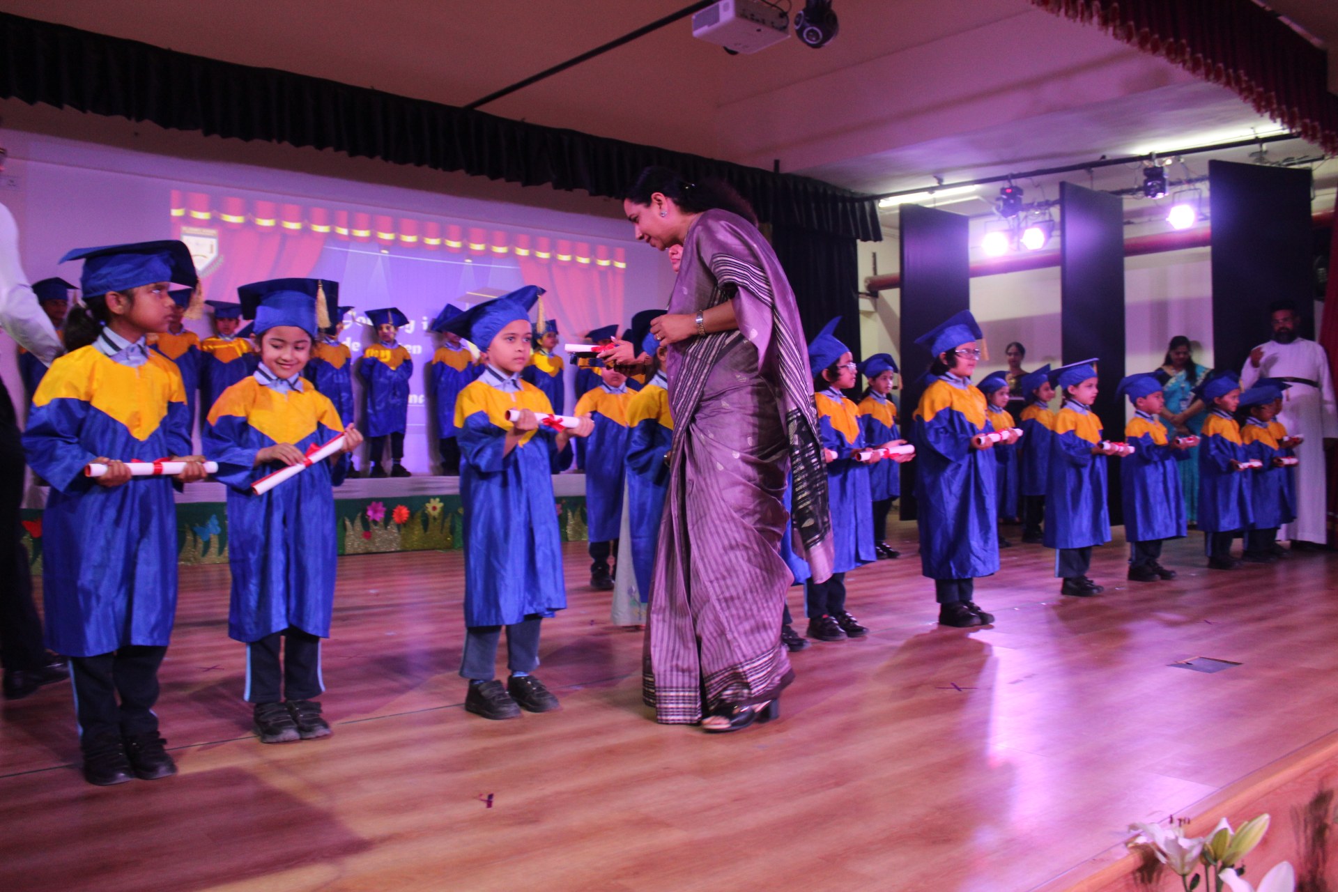 The highlight of the event was the grand convocation procession. Dressed in adorable graduation robes, the young scholars walked gracefully across the stage. The hall echoed with applause as each child received their Scroll of Merit, marking their achievements and readiness for the next academic step.