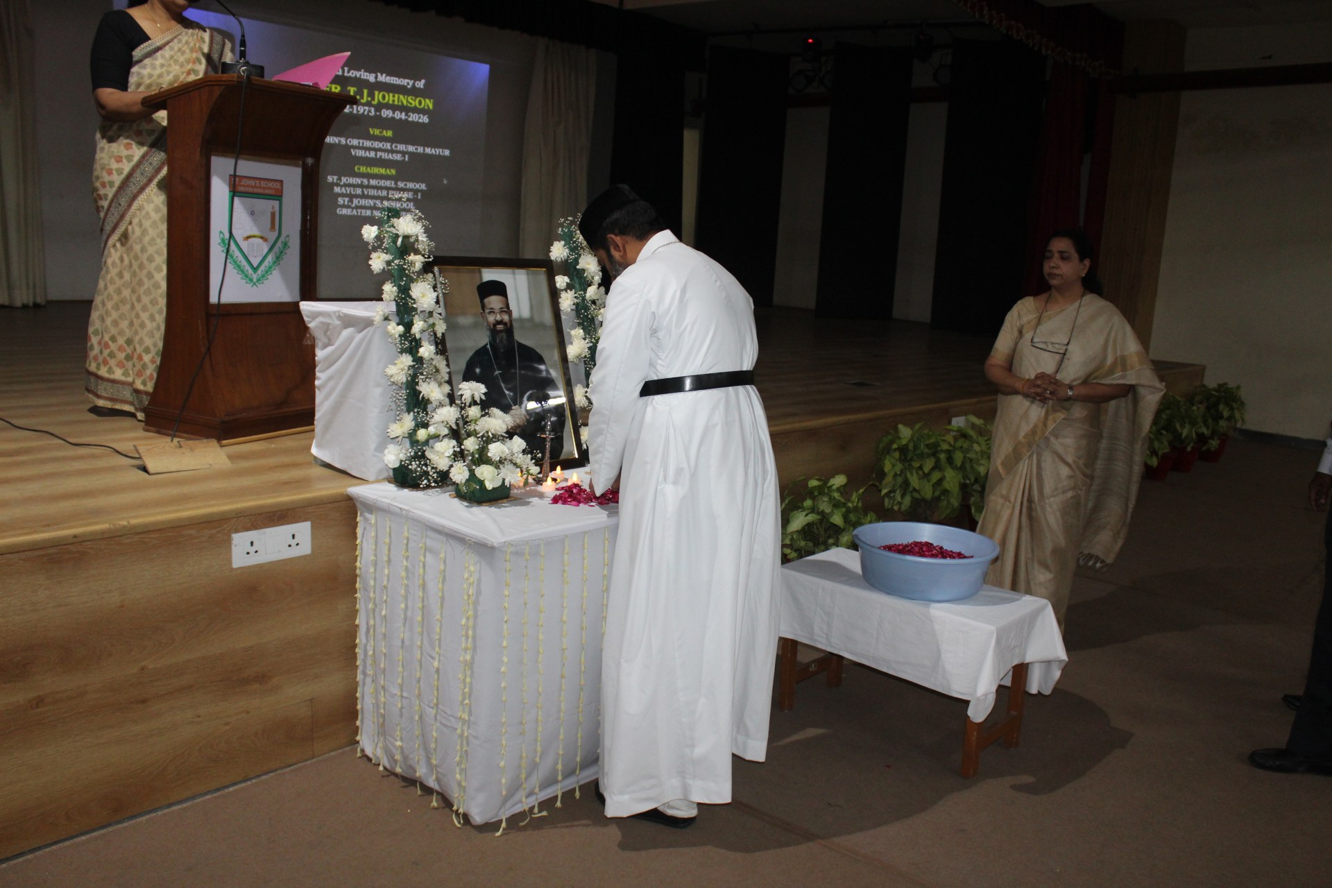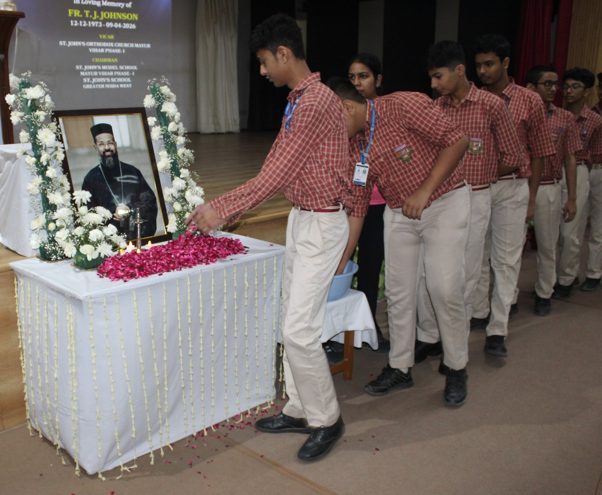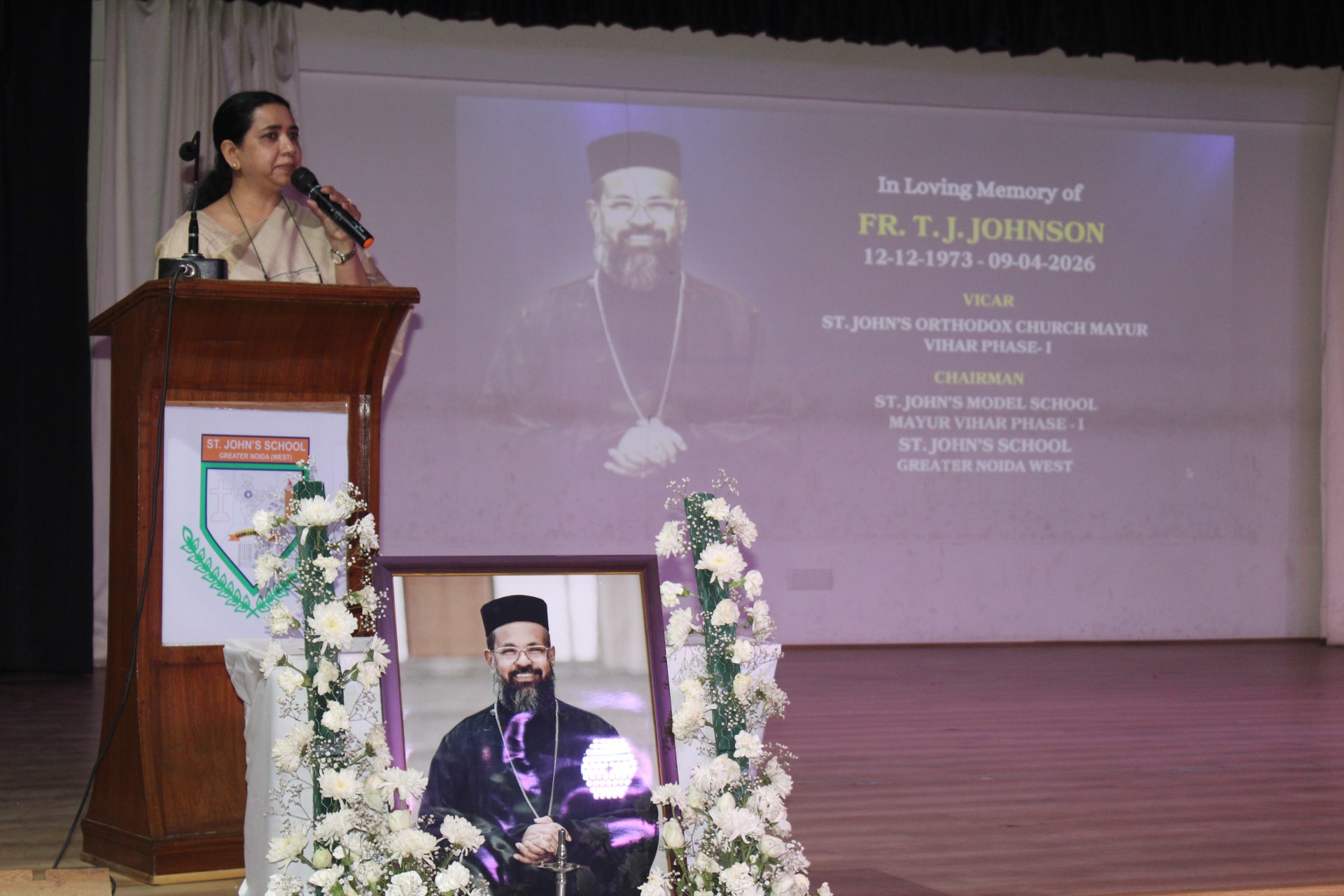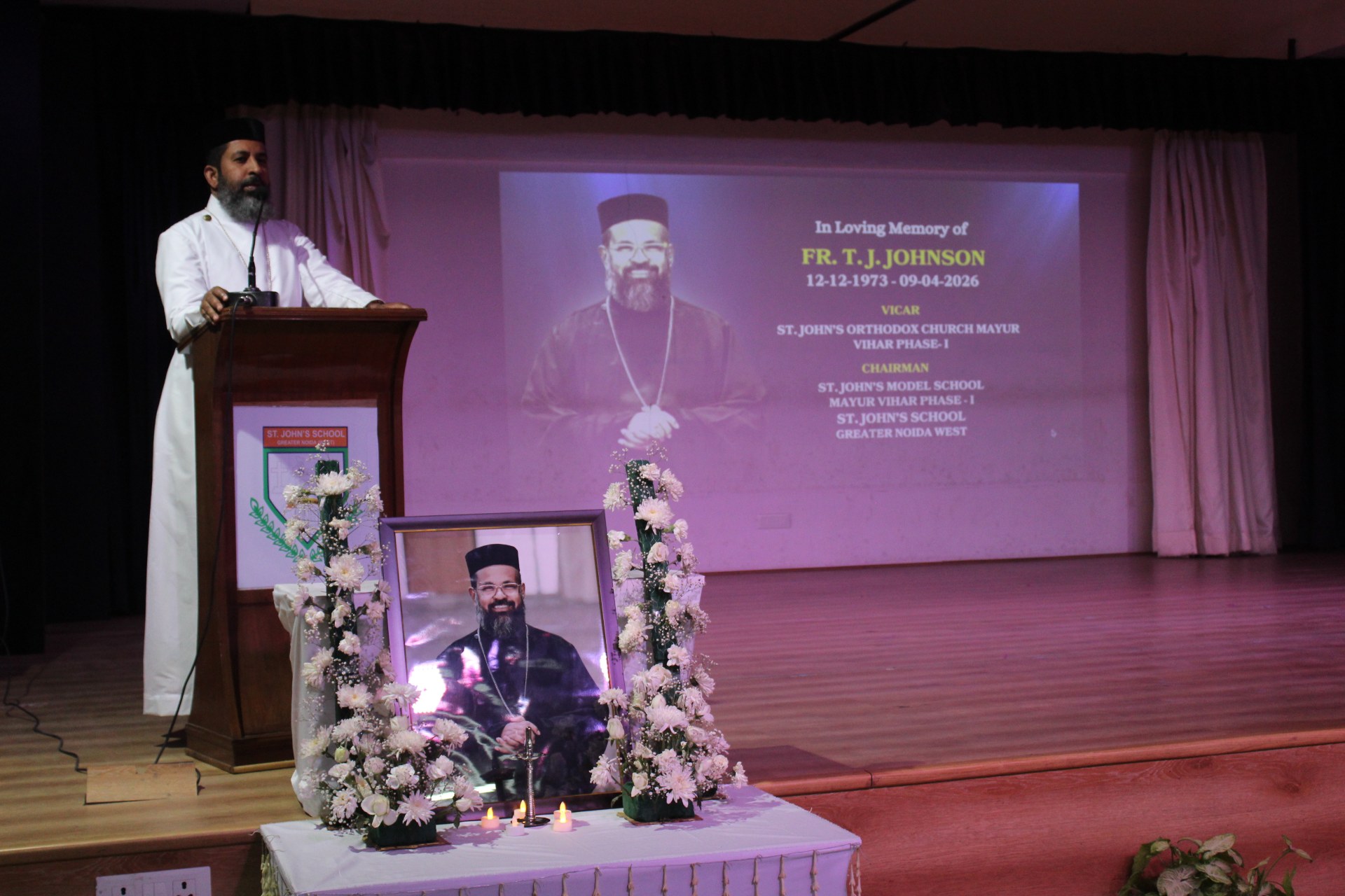 On 13th April 2026, the school community of St. John’s School, Greater Noida, assembled to pay tribute to Fr. T. J. Johnson, former Chairman of the institution, in the presence of Rev. Fr. Saji Abraham, Mr. Varghese Thomas (Vice-Chairman), Mr. Thomas Kurian (Secretary), and Mr. Shiju P. V. (Treasurer). The gathering was marked by quiet respect as staff and students came together to remember his life and contributions. The programme began with a prayer by the staff choir, followed by an address by the Principal, Mrs. Reeja Ninan, who expressed gratitude for his guidance, especially his concern for students’ mental well-being and staff welfare. Scripture readings by Ms. Riya Roy and Mr. Varahmihir set a reflective tone, after which Ms. Divya James shared insights into his leadership and association with the school. Student representatives shared their memories, and a visual presentation highlighted his life of service. The programme concluded with a floral tribute, as members of the school community offered their respects with dignity. The gathering stood as a sincere farewell to a life devoted to service and guidance.