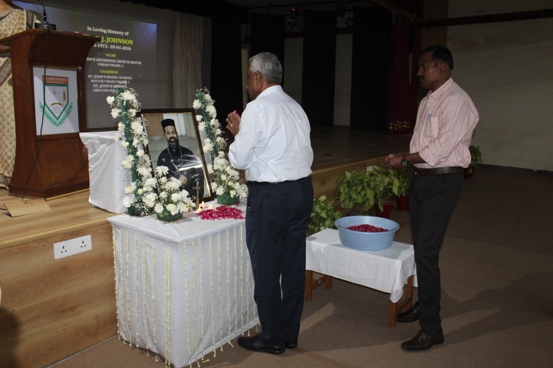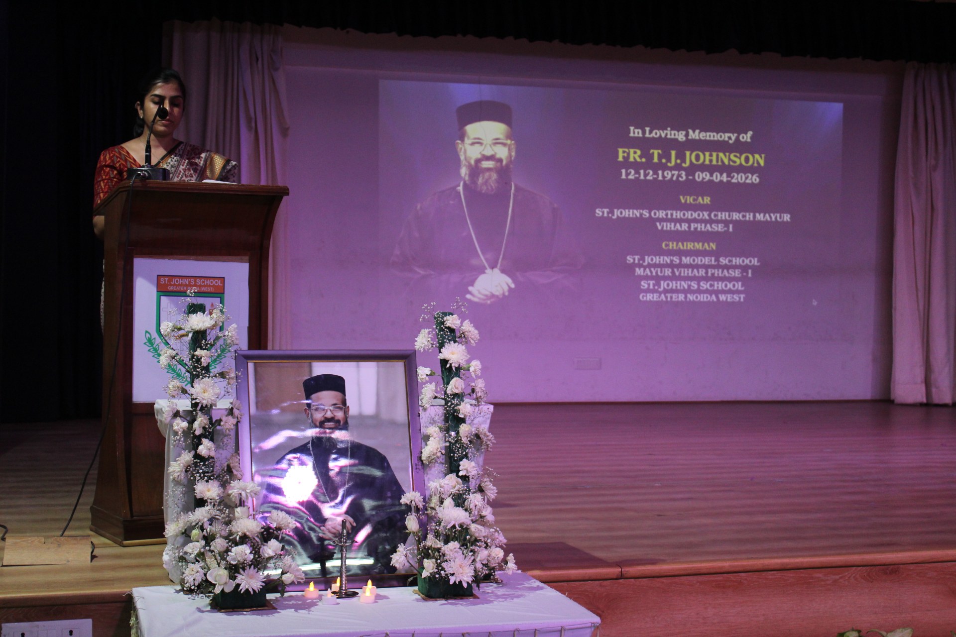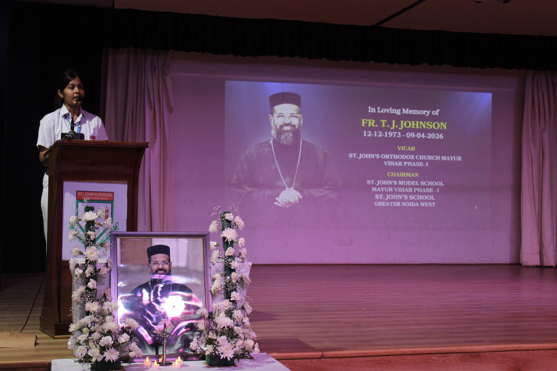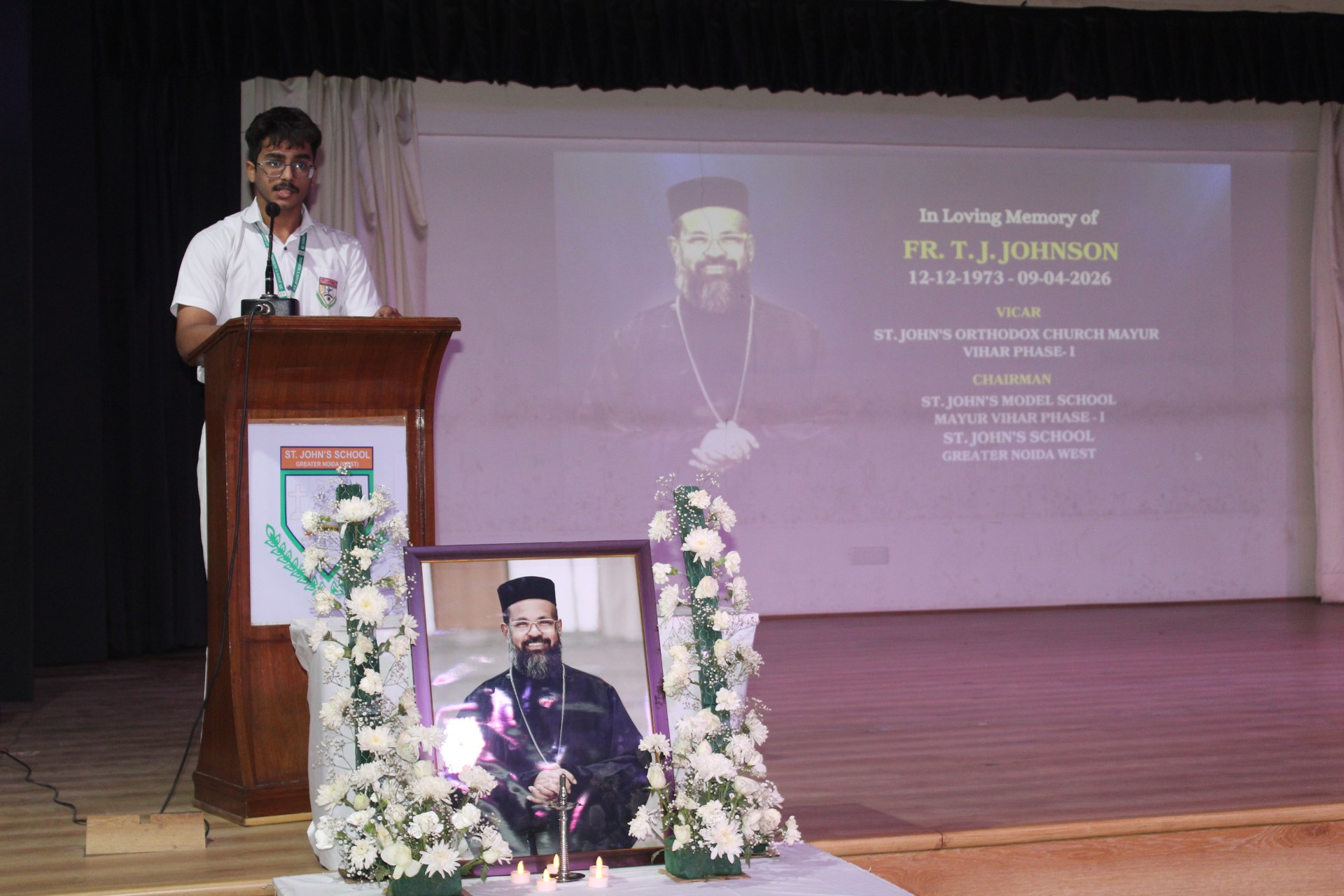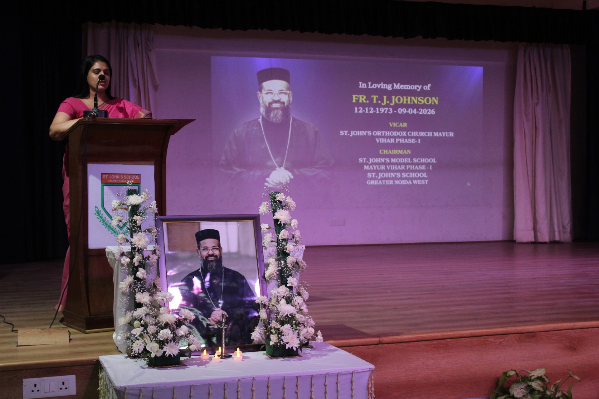 On 13th April 2026, the school community of St. John’s School, Greater Noida, assembled to pay tribute to Fr. T. J. Johnson, former Chairman of the institution, in the presence of Rev. Fr. Saji Abraham, Mr. Varghese Thomas (Vice-Chairman), Mr. Thomas Kurian (Secretary), and Mr. Shiju P. V. (Treasurer). The gathering was marked by quiet respect as staff and students came together to remember his life and contributions. The programme began with a prayer by the staff choir, followed by an address by the Principal, Mrs. Reeja Ninan, who expressed gratitude for his guidance, especially his concern for students’ mental well-being and staff welfare. Scripture readings by Ms. Riya Roy and Mr. Varahmihir set a reflective tone, after which Ms. Divya James shared insights into his leadership and association with the school. Student representatives shared their memories, and a visual presentation highlighted his life of service. The programme concluded with a floral tribute, as members of the school community offered their respects with dignity. The gathering stood as a sincere farewell to a life devoted to service and guidance.