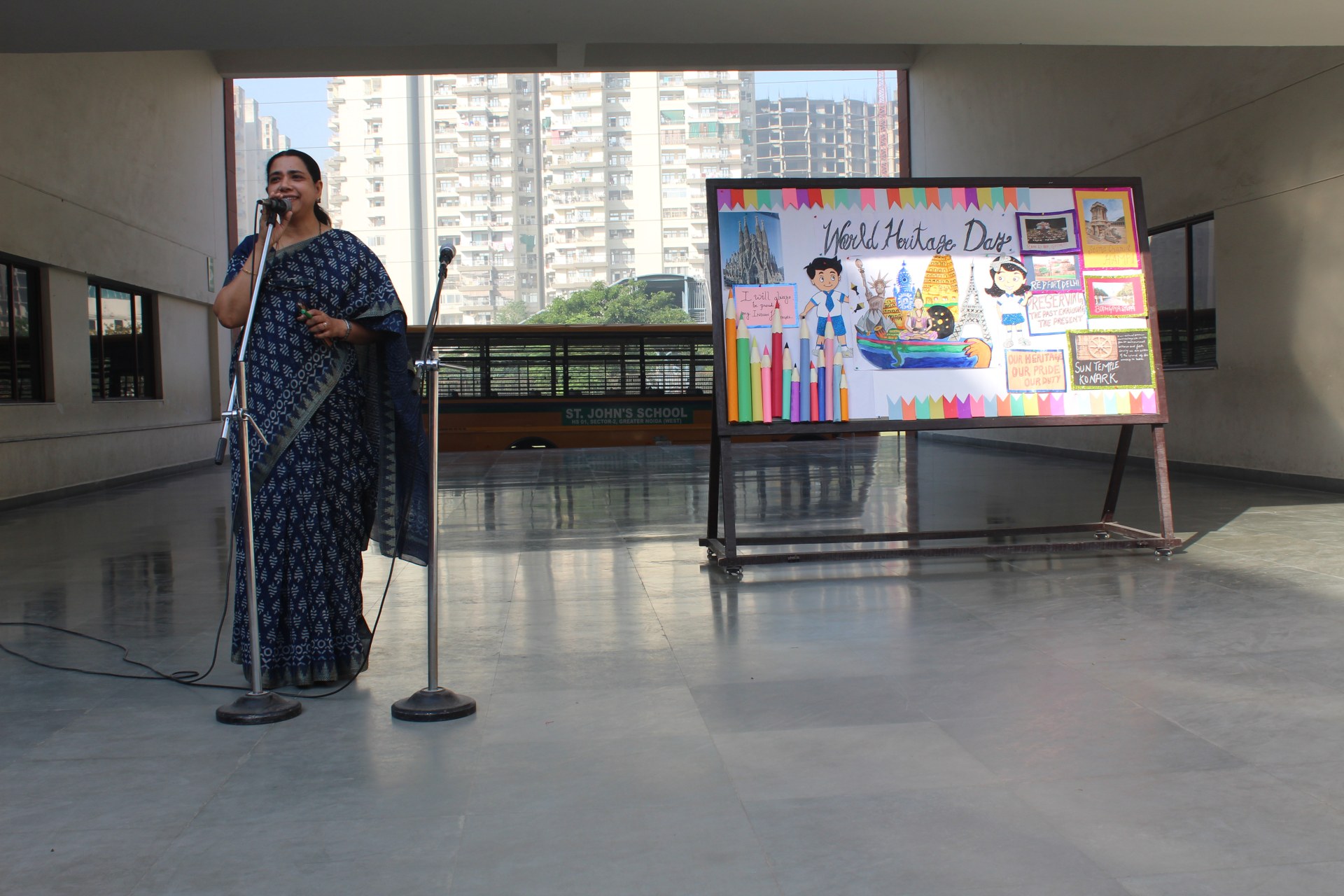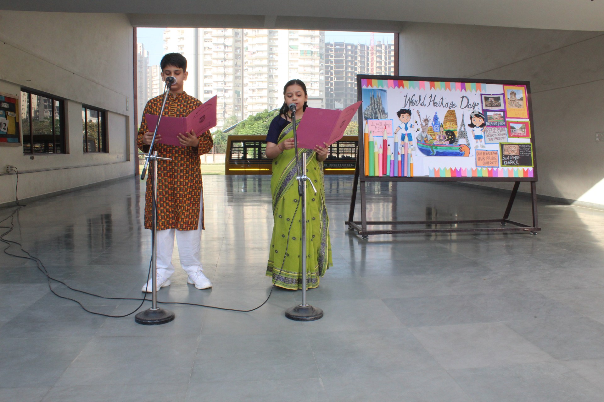 Students presented an informative speech on the significance of World Heritage Day, explaining how it is celebrated worldwide to promote awareness about protecting historical monuments, traditions, and cultural diversity. They shared examples of India’s famous heritage sites and spoke about our responsibility as citizens to safeguard them. The students also presented a poem that beautifully expressed pride in our nation’s heritage.