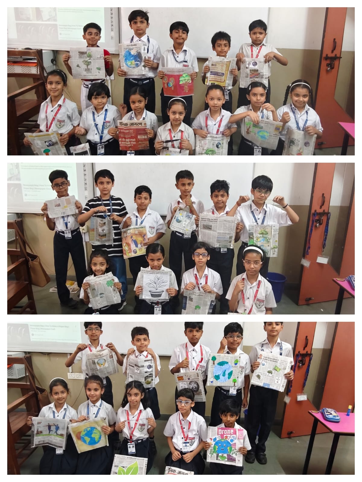 Students of Grade III created eco-friendly newspaper bags and decorated them with beautiful cut-outs of the Earth, plants, and trees. This activity helped them understand the importance of reducing plastic use and promoted the values of reuse and recycling. Students of Grades IV and V participated in the “Trash to Treasure – Best Out of Waste” activity held on Friday, 17th April 2026, where they transformed waste materials into useful and decorative items. Their innovative ideas reflected a deep understanding of sustainability and responsible use of resources.