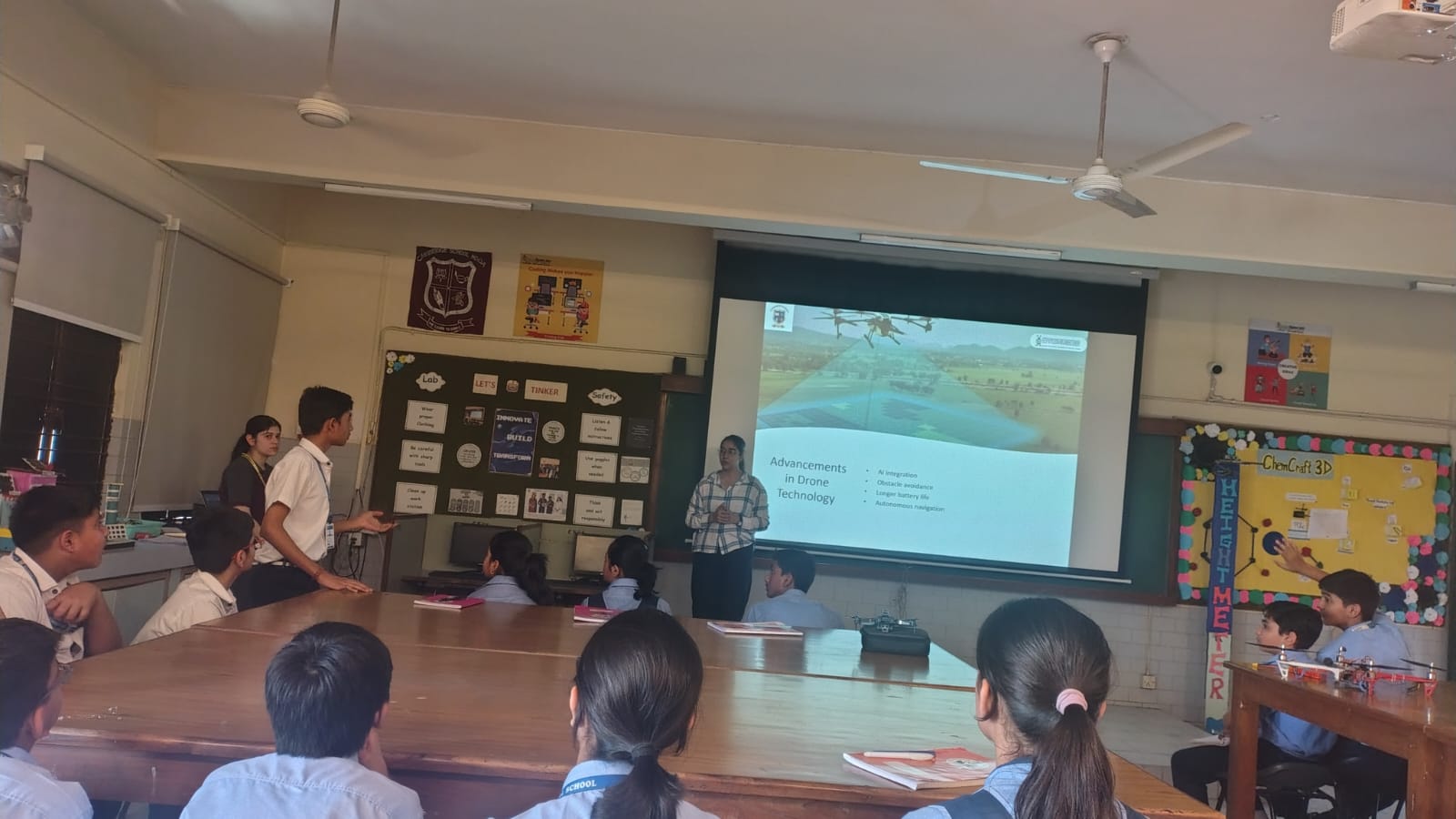 The visit aimed to provide hands-on STEM learning and exposure to emerging technologies. One of the key highlights was the drone demonstration and flying session, where students learned about drone components, their working, and real-life applications, along with witnessing live flying. Another activity, “Glowing Idea Bulb,” encouraged students to present their innovative ideas creatively.